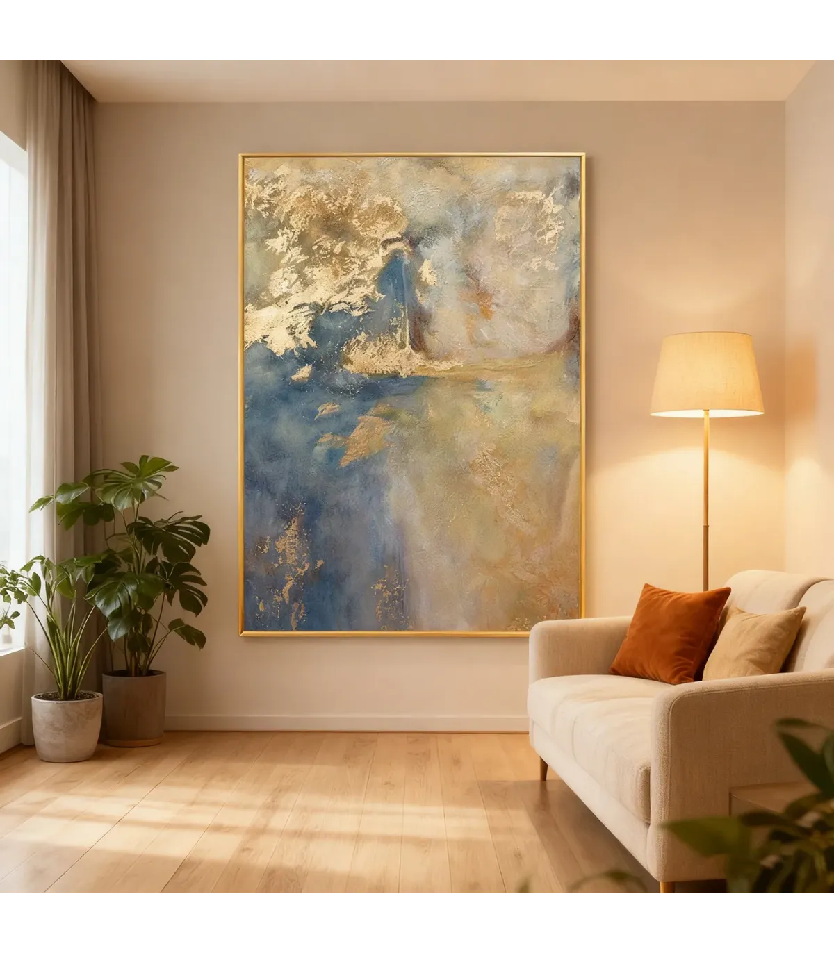 This abstract painting is a celebration of texture and movement. Hand-painted with palette knife techniques, it blends rich oil pigments in shades of blue, gold, and beige to create a dynamic composition. The textured canvas catches light beautifully, making it a refined addition to modern wall art collections and luxury interiors.