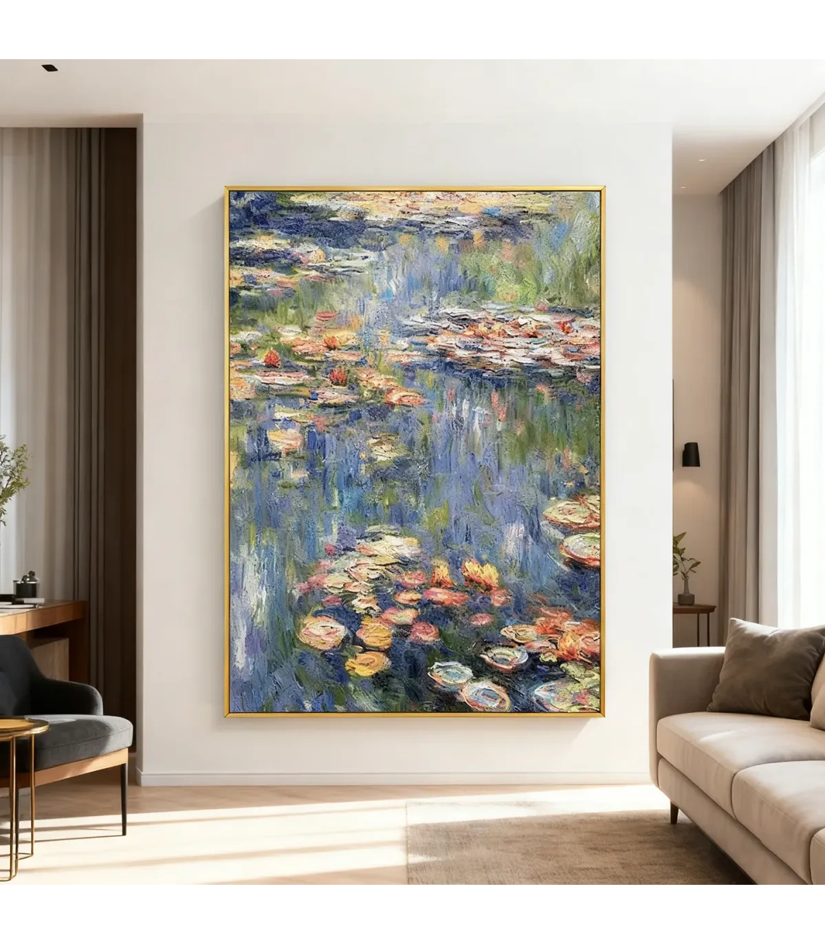 Immerse your space in serene elegance with this hand-painted homage to Monet’s Water Lilies. Its layered brushwork and dreamy palette evoke timeless calm, ideal for elevating Japandi Wabi Sabi Canvas Living Room or Handmade Wabi Sabi Painting Living Room decor.