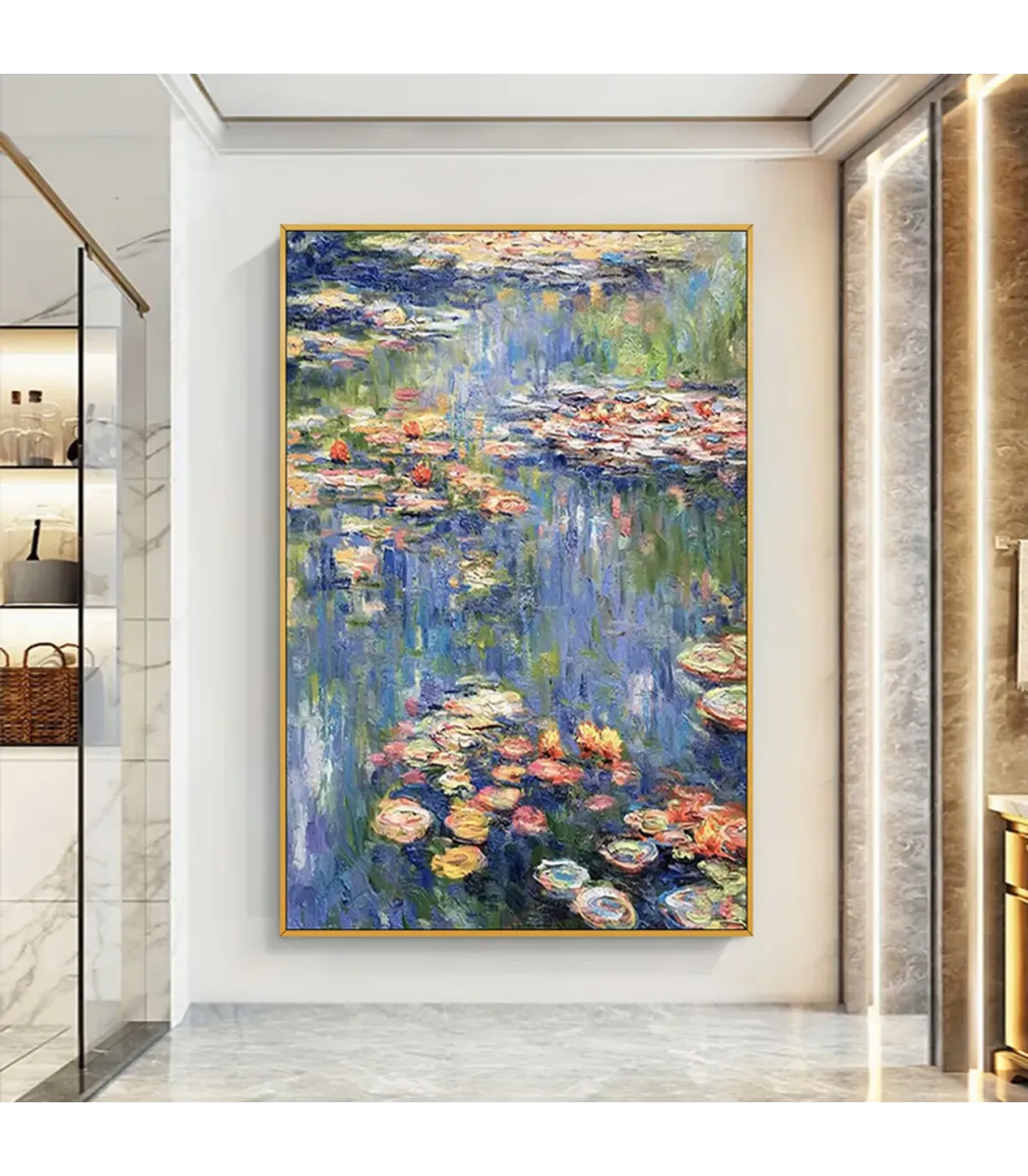 Crafted with rich oil textures and expressive brushwork, this water lilies painting captures the serenity of nature in a refined, abstract form. Each stroke is applied by hand, creating a unique depth and movement that elevates any space. Whether placed in a modern living room or a transitional hallway, this piece adds a tranquil yet sophisticated atmosphere that complements minimalist and luxury interiors alike.