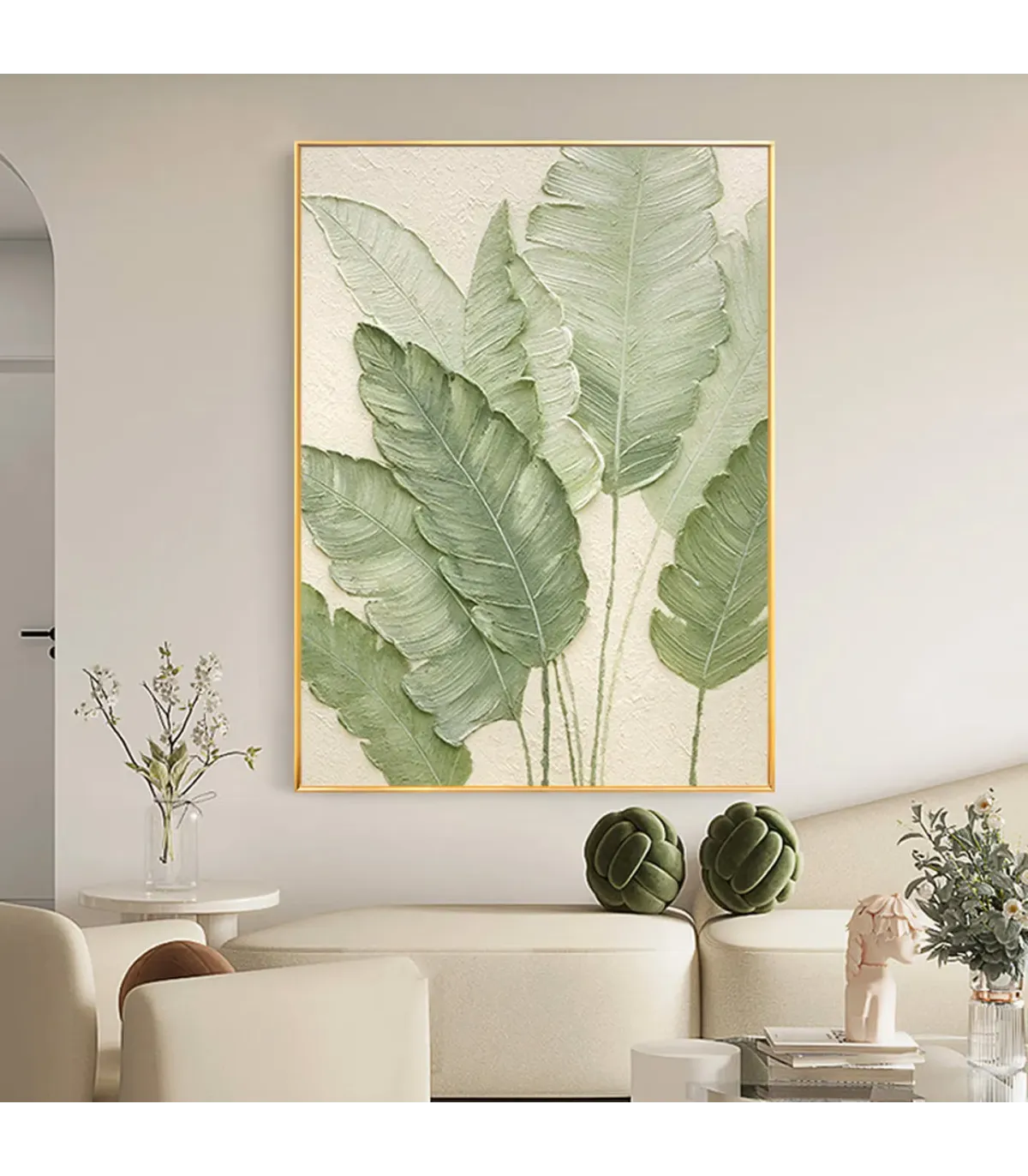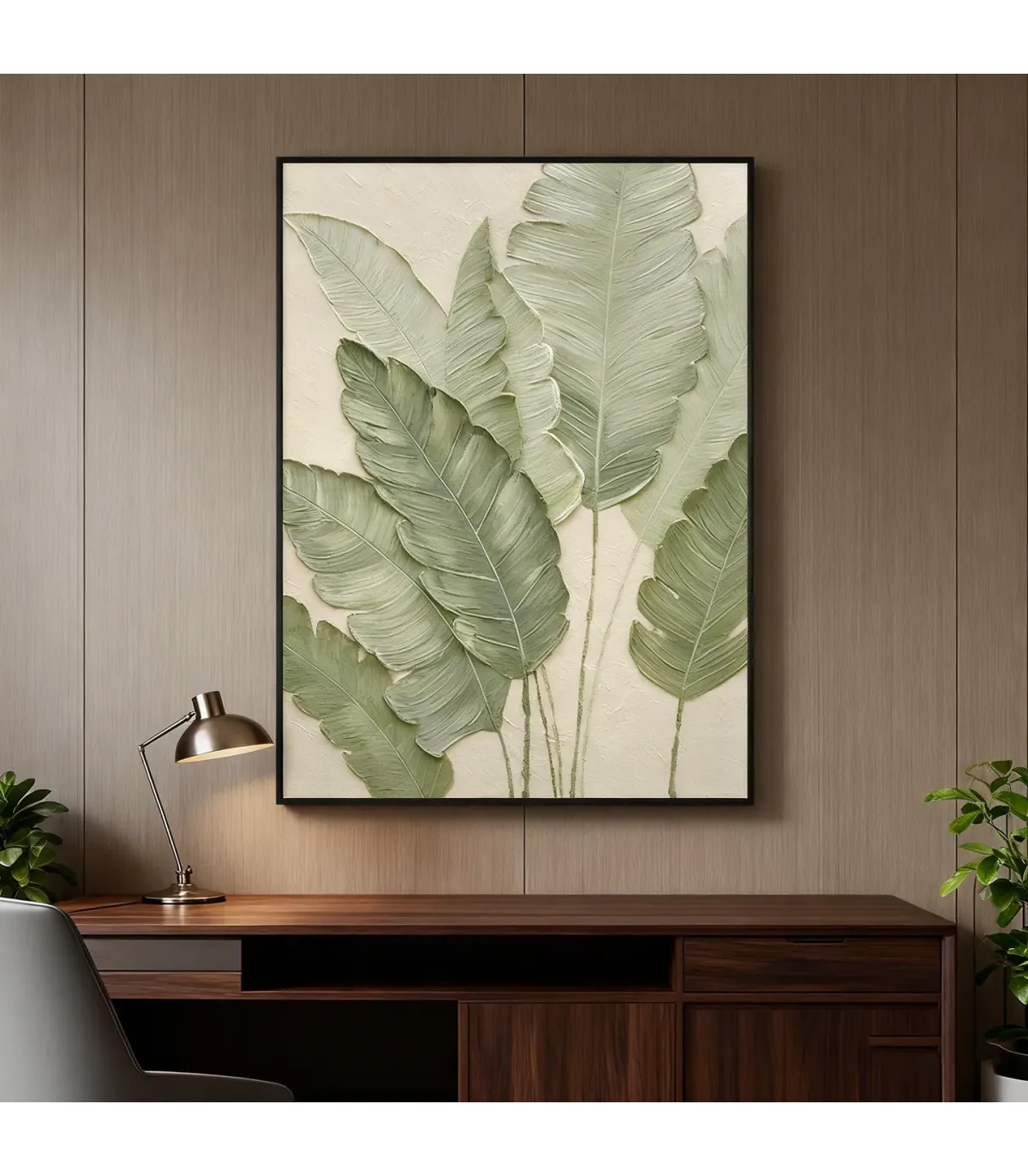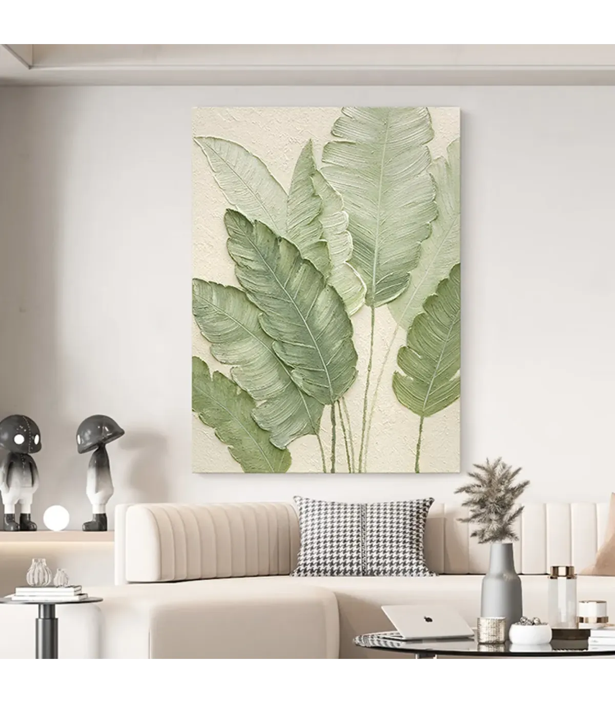 Hand-painted with sculptural banana leaves, this 3D textured canvas evokes tropical serenity and organic rhythm. Ideal for living rooms or bedrooms seeking a neutral yet expressive focal point. A refined choice for Raised Texture Painting Living Room and Neutral Tone Textured Canvas Bedroom.