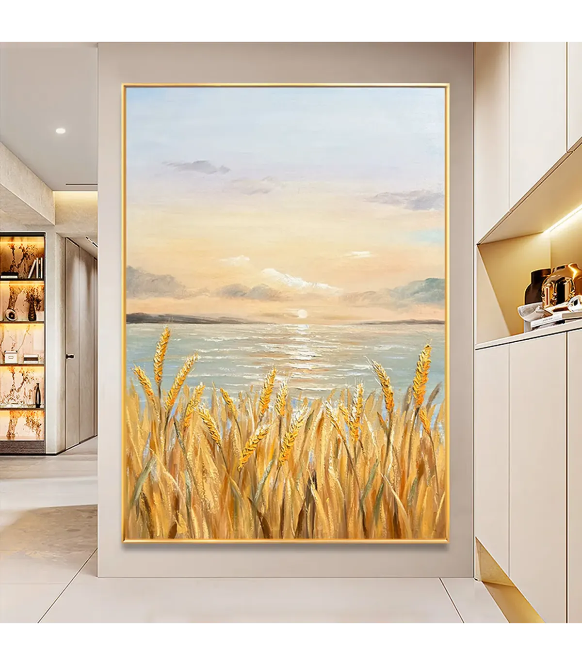 Crafted with rich texture and delicate brushwork, this abstract oil painting captures the golden glow of wheat fields meeting a calm sea under a pastel sky. The palette evokes warmth and tranquility, making it a perfect statement piece for modern interiors. Whether placed in a hallway, living room, or behind a sofa, this wall art elevates your space with its serene composition and timeless charm.