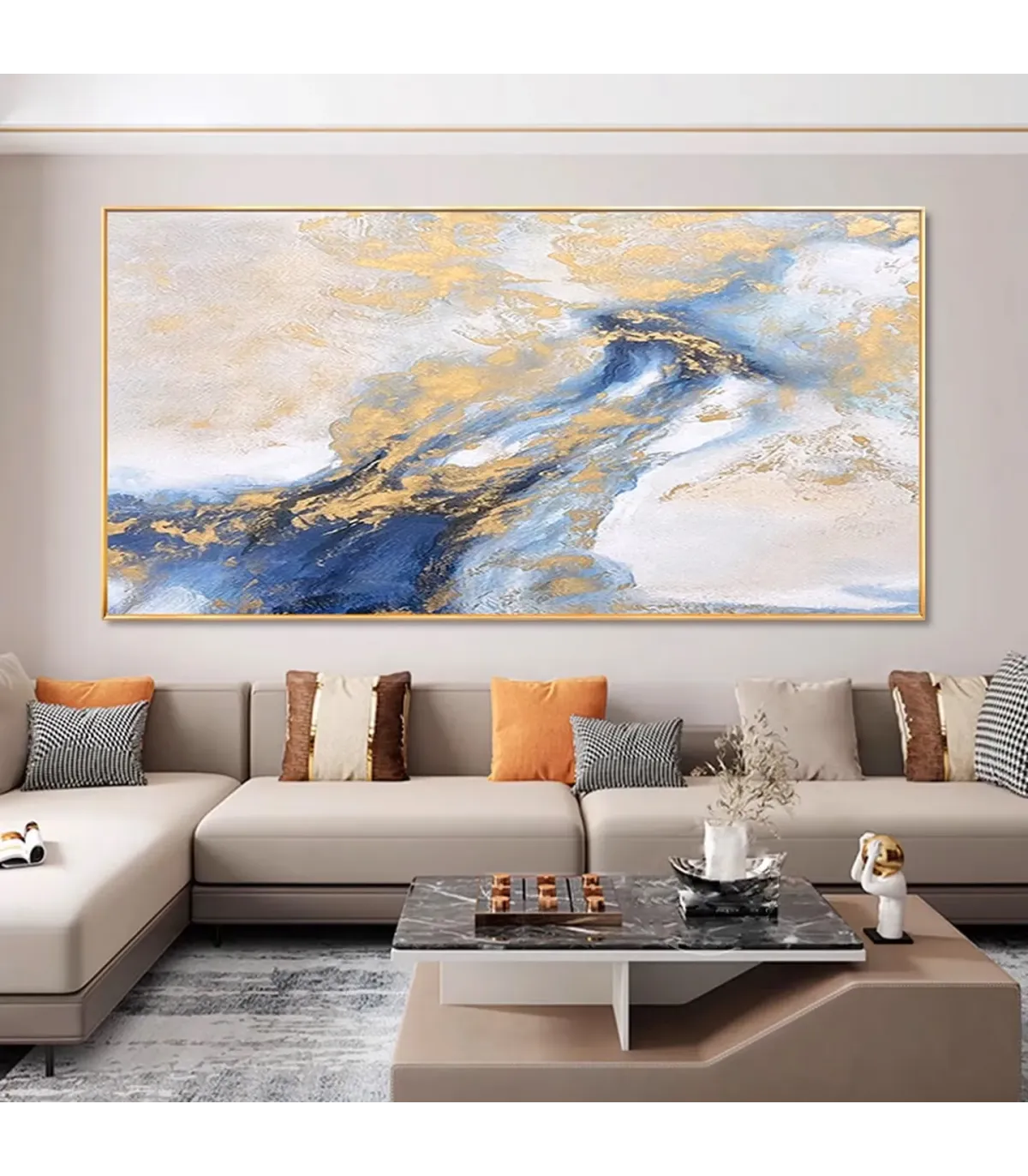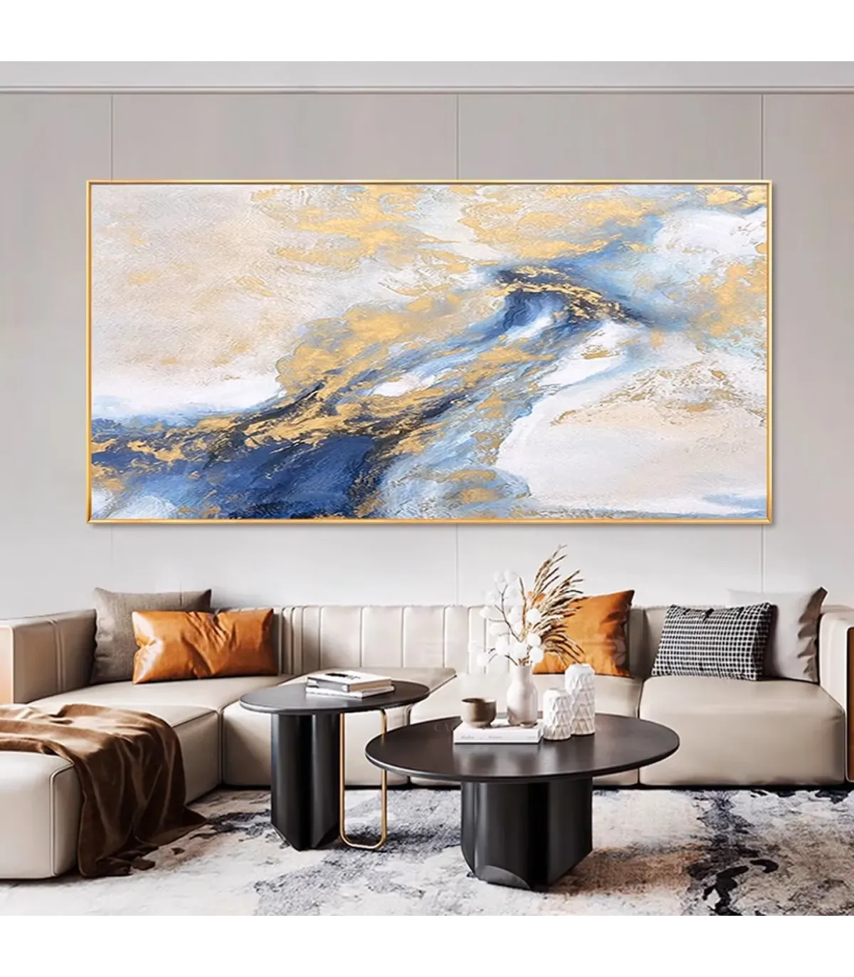 This abstract oil painting blends fluid motion with rich texture, creating a captivating focal point for contemporary interiors. Each canvas is hand-painted, showcasing luminous swirls of blue, gold, and white that evoke a sense of depth and serenity. Ideal for modern living rooms, bedrooms, or lounge areas, this decorative wall art adds a refined touch to minimalist and luxury spaces.