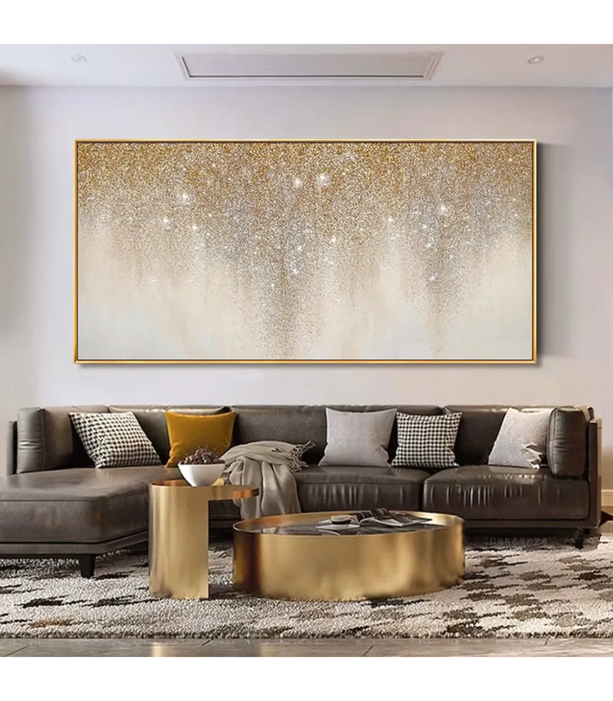 This handmade canvas features a shimmering gradient of gold and silver particles cascading over a warm beige-to-white backdrop. Its ethereal elegance and subtle texture make it ideal for refined interiors. Perfect for Beige Textured Canvas Entryway and Neutral Tone Wabi Sabi Painting Bedroom settings.