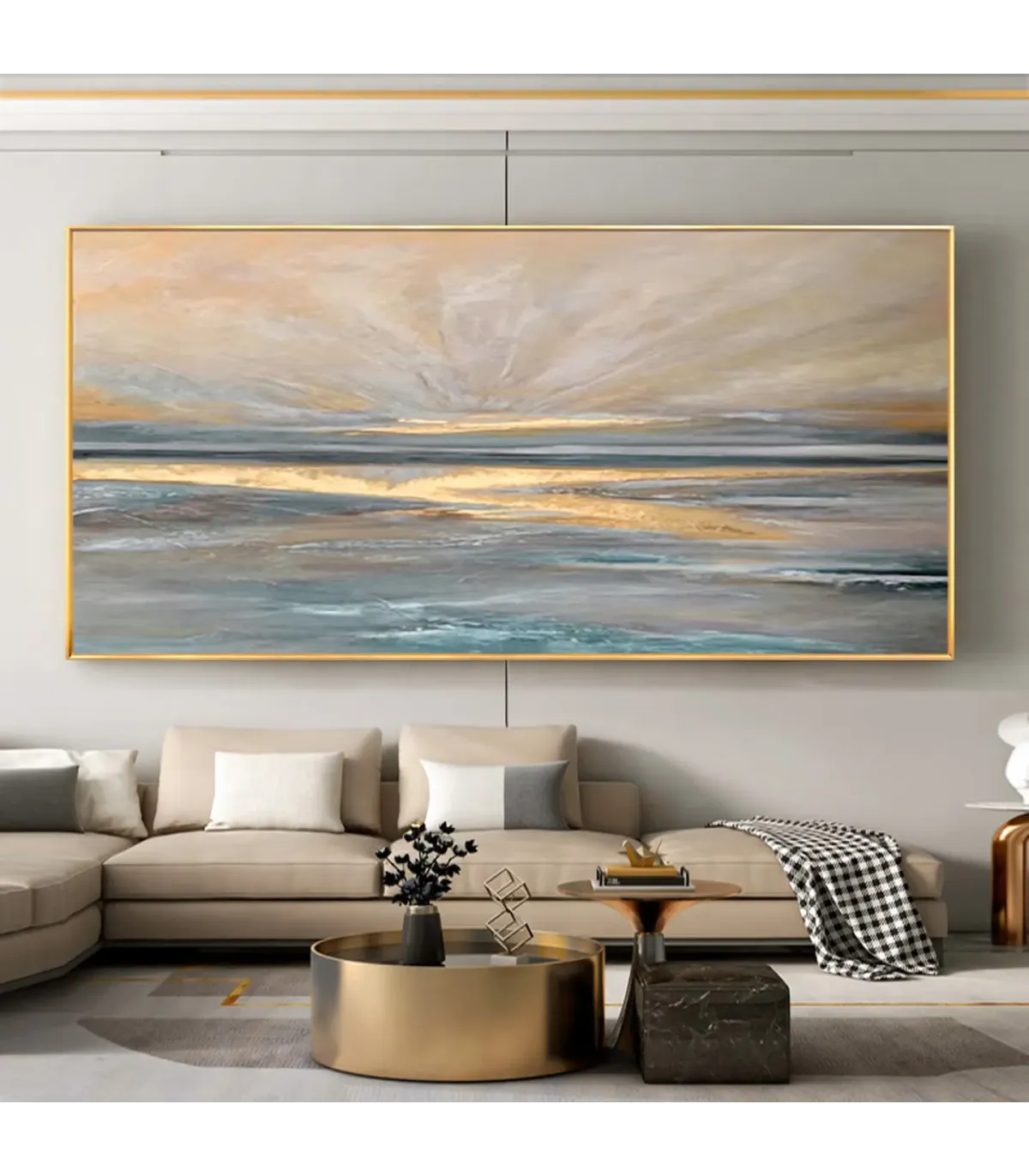 This handmade painting captures a tranquil seascape at sunrise, blending warm peach and golden tones with soft gray waves. Its minimalist composition and neutral palette evoke serenity and depth, ideal for Japandi Minimalist Canvas Dining Room or Minimalist Zen Wall Art Living Room settings.