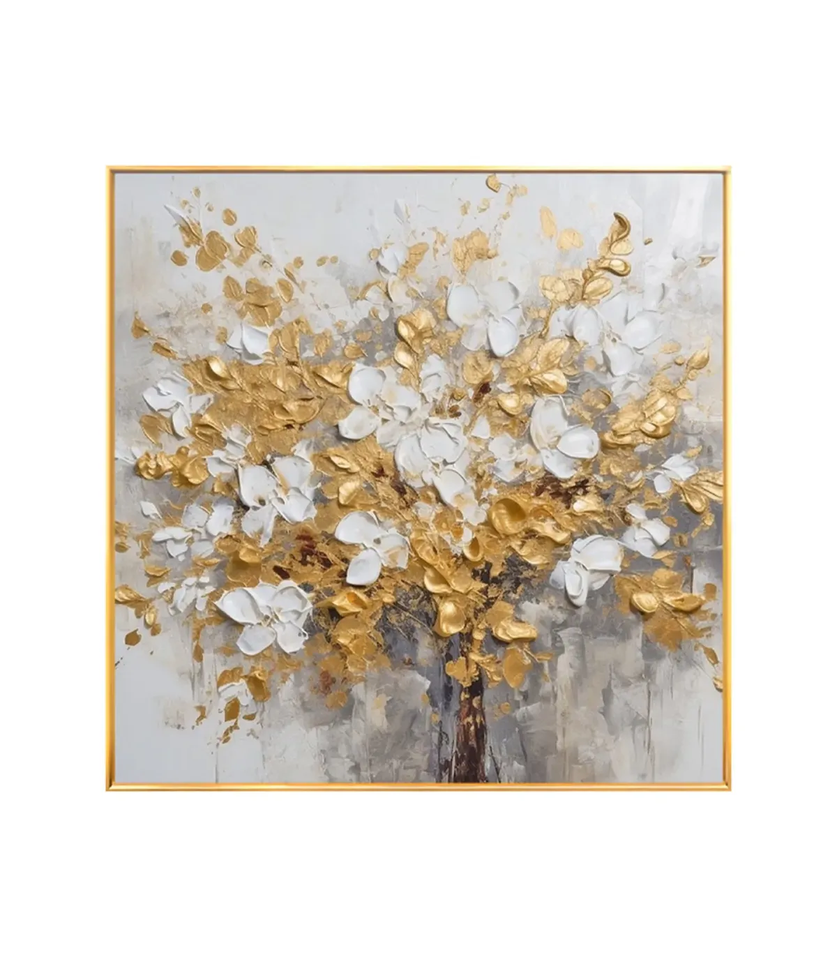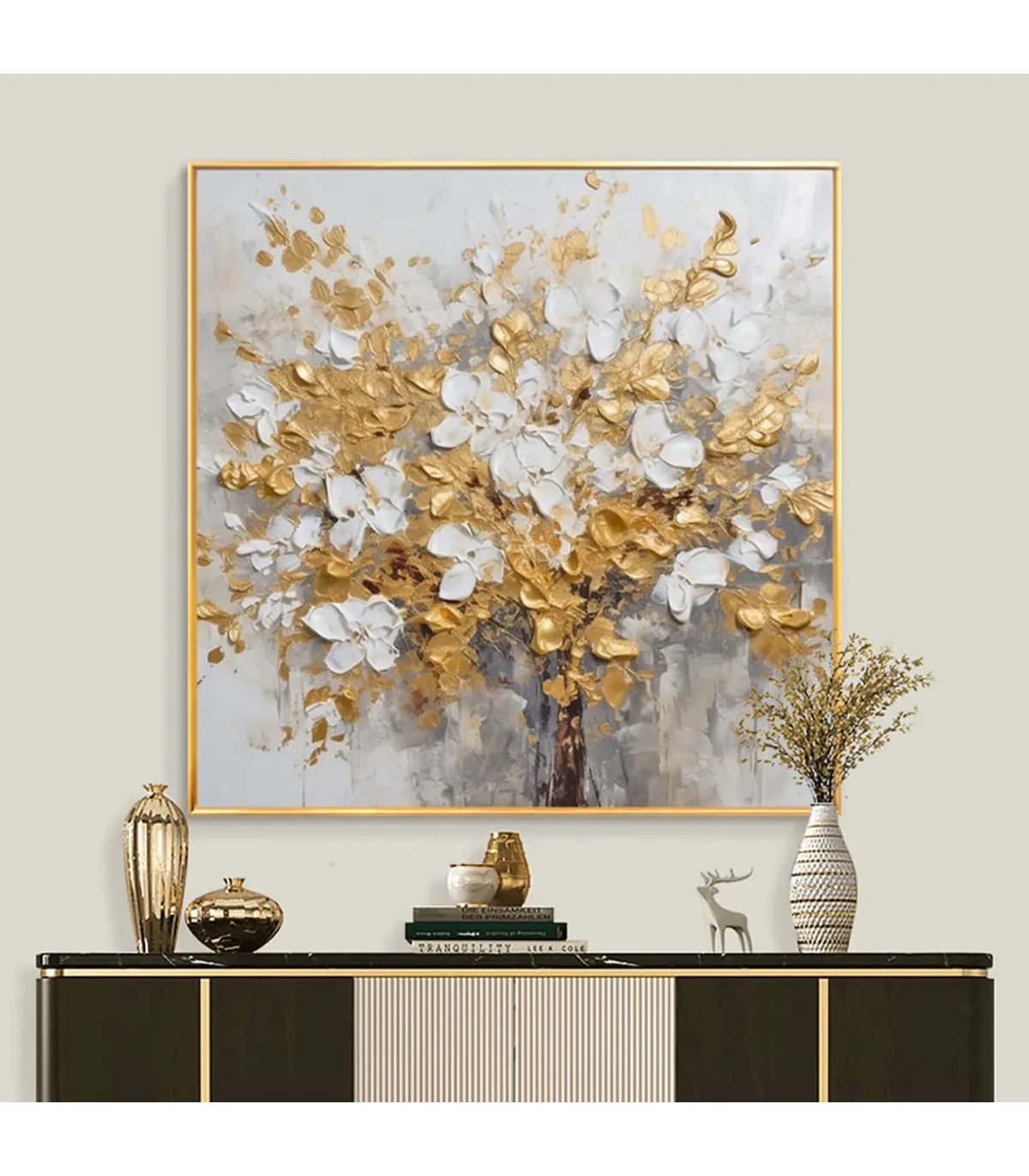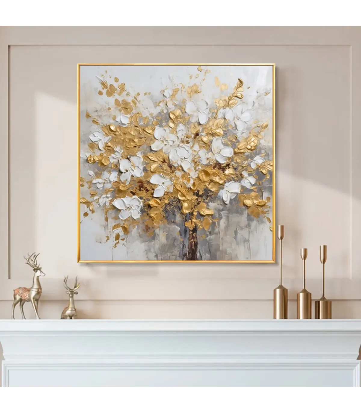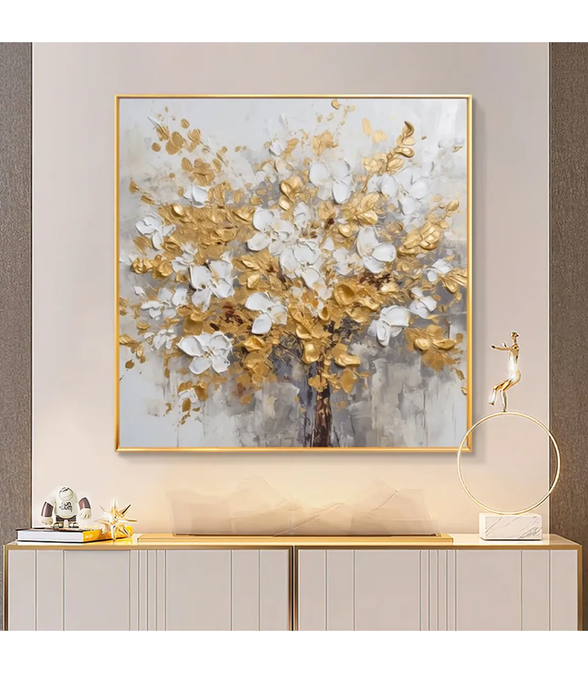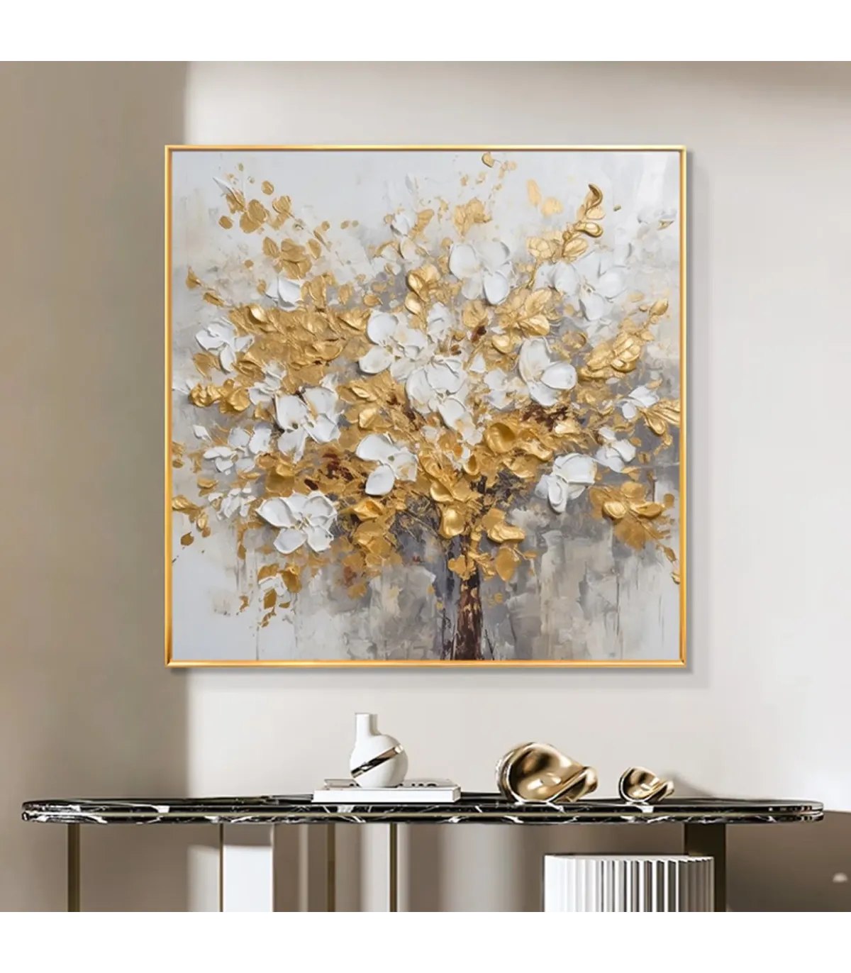 This handmade textured painting features a golden tree in bloom, set against a neutral backdrop. Its impasto technique adds depth and elegance, ideal for elevating dining rooms or office spaces with a touch of nature-inspired serenity.