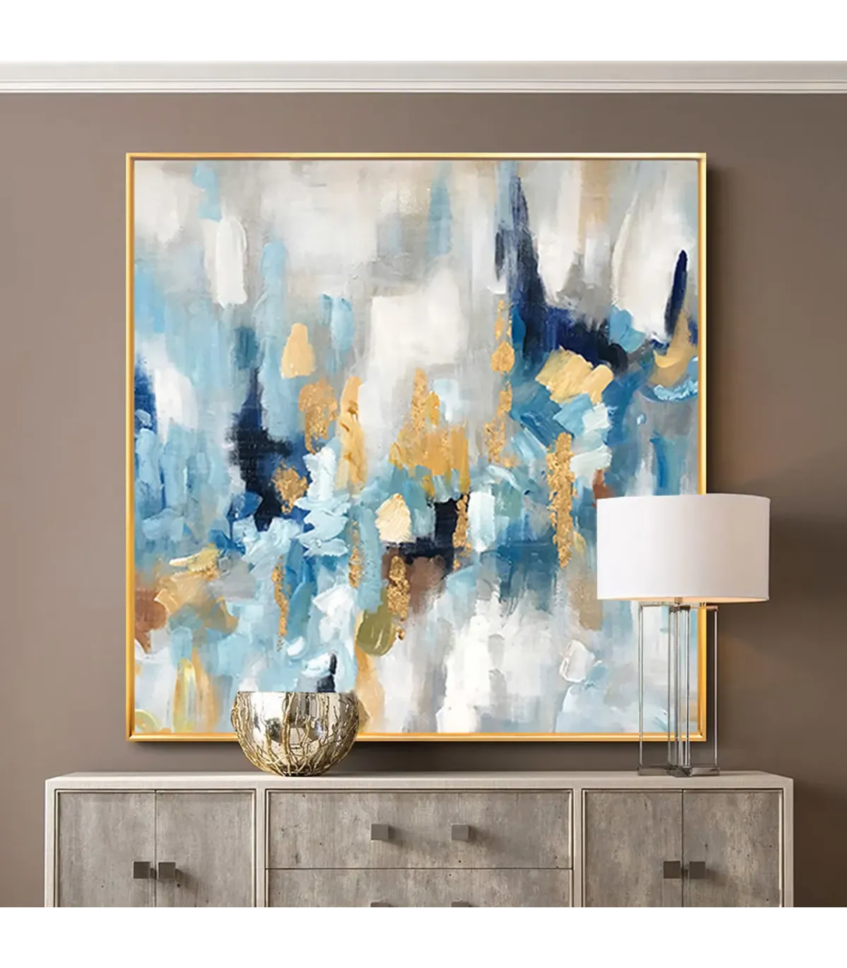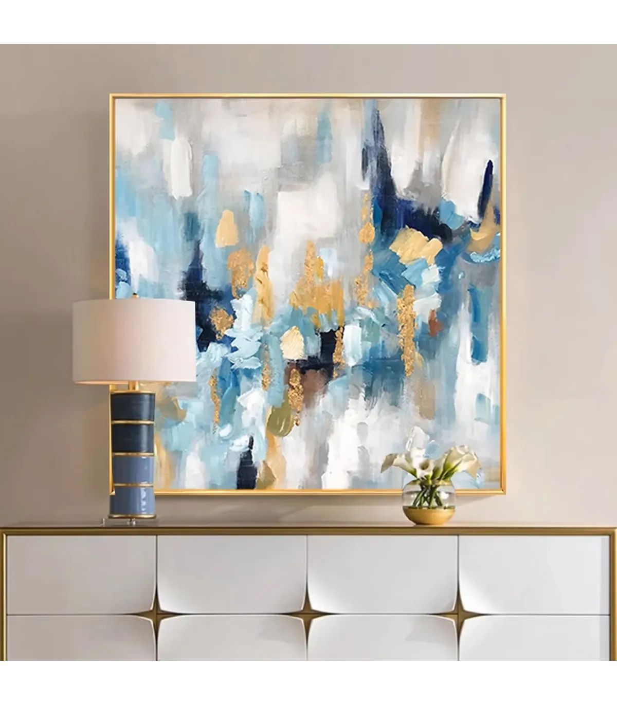 This hand-painted canvas features expressive blue, white, and gold brushstrokes that create depth and movement, offering strong artistic appeal and a calming contemporary vibe. Ideal for elevating a Minimalist Large Canvas Dining Room aesthetic or adding elegance to a Modern Abstract Wall Art Fireplace setting.