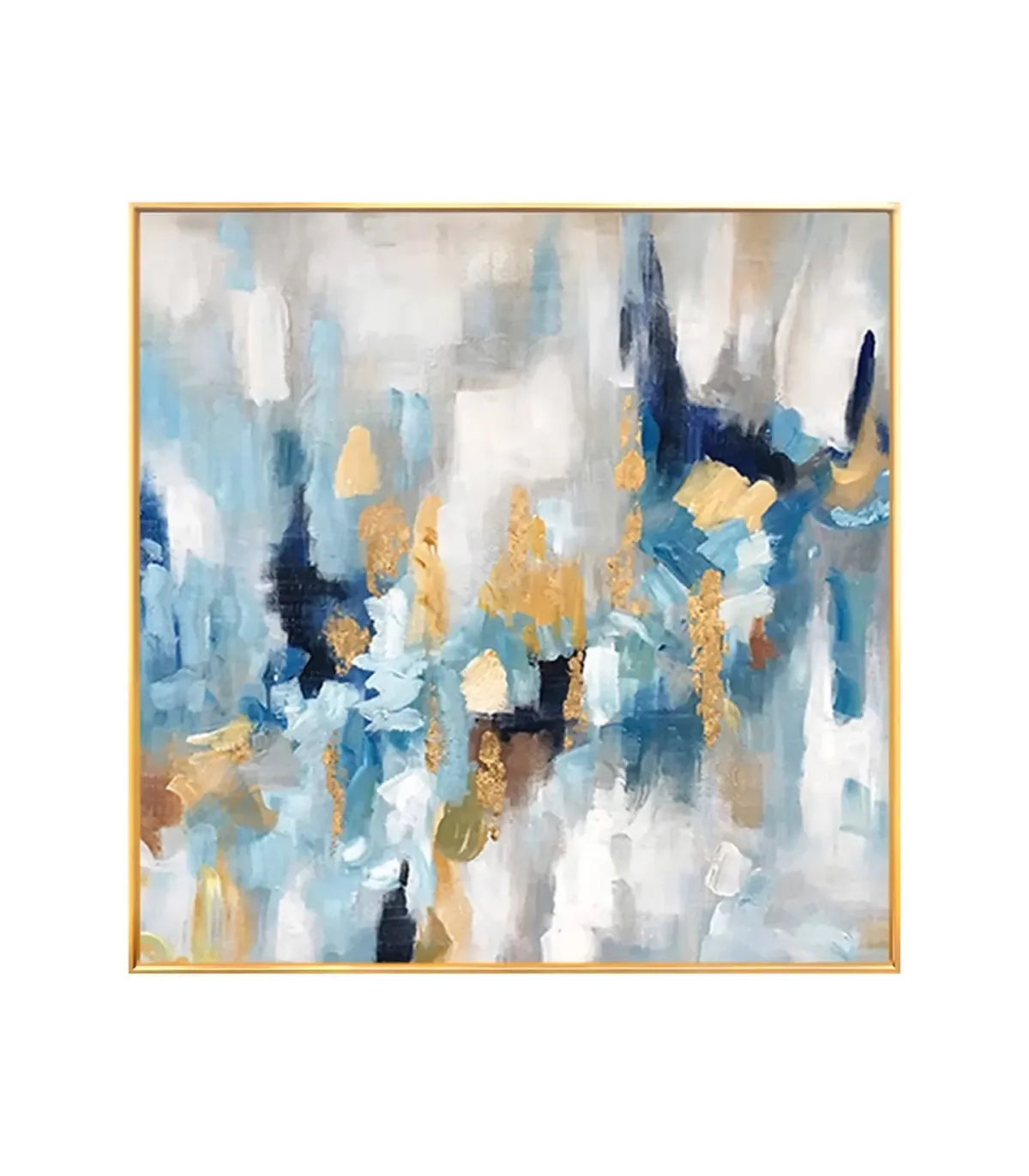 This abstract gold foil textured painting blends contemporary design with artistic depth. Each canvas is hand-painted, showcasing expressive brushstrokes in blue, white, and black, layered with shimmering gold foil. The composition evokes movement and sophistication, making it a striking focal point for any modern living room, hallway, or dining space. Whether you're curating a minimalist aesthetic or adding a touch of luxury, this artwork transforms your wall into a gallery-worthy statement.
