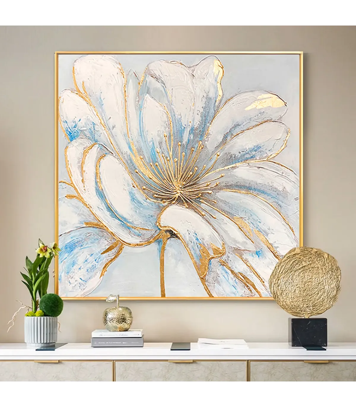 This decorative painting showcases a stylized flower rendered in soft white and blue tones, enriched with shimmering gold foil details. Each piece is meticulously hand-painted, offering a unique texture and depth that machine prints cannot replicate. Designed for contemporary interiors, it adds a refined touch to living rooms, dining spaces, and hallway walls. Whether you prefer a minimalist look or a statement piece, this floral wall art brings harmony and sophistication to any setting.