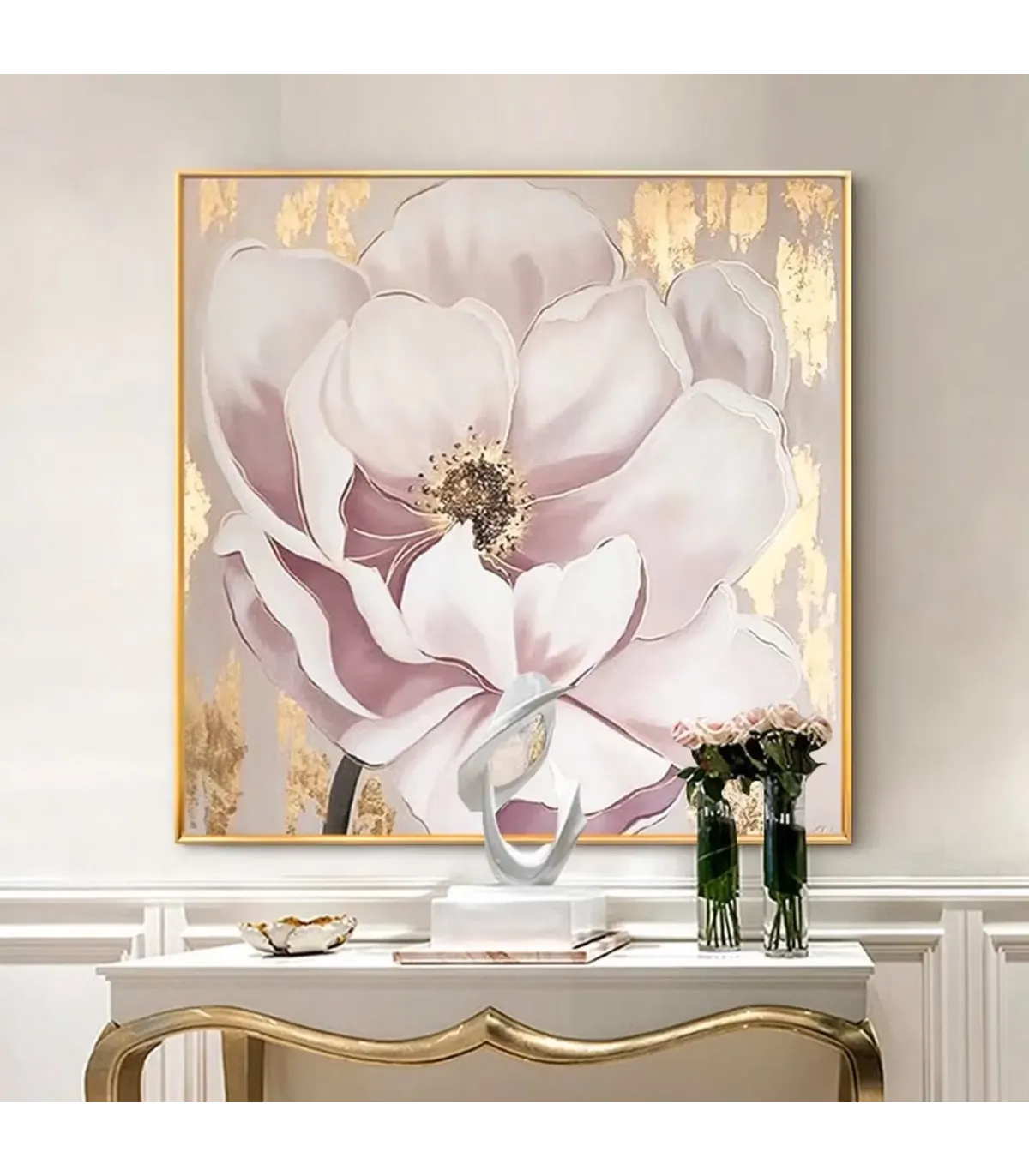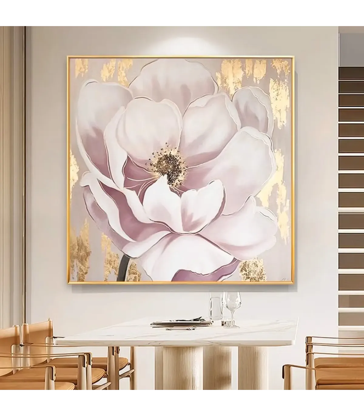 This large-format floral wall art captures the essence of contemporary sophistication. The hand-painted pink and white petals radiate warmth and serenity, while the dark center adds depth and contrast. Gold foil detailing elevates the artwork with a touch of glamour, making it a perfect statement piece for modern interiors. Whether placed in a hallway, dining area, or living room, this oil painting transforms any wall into a refined focal point.