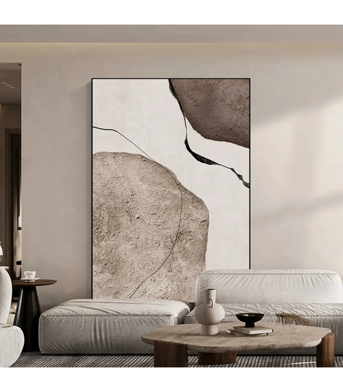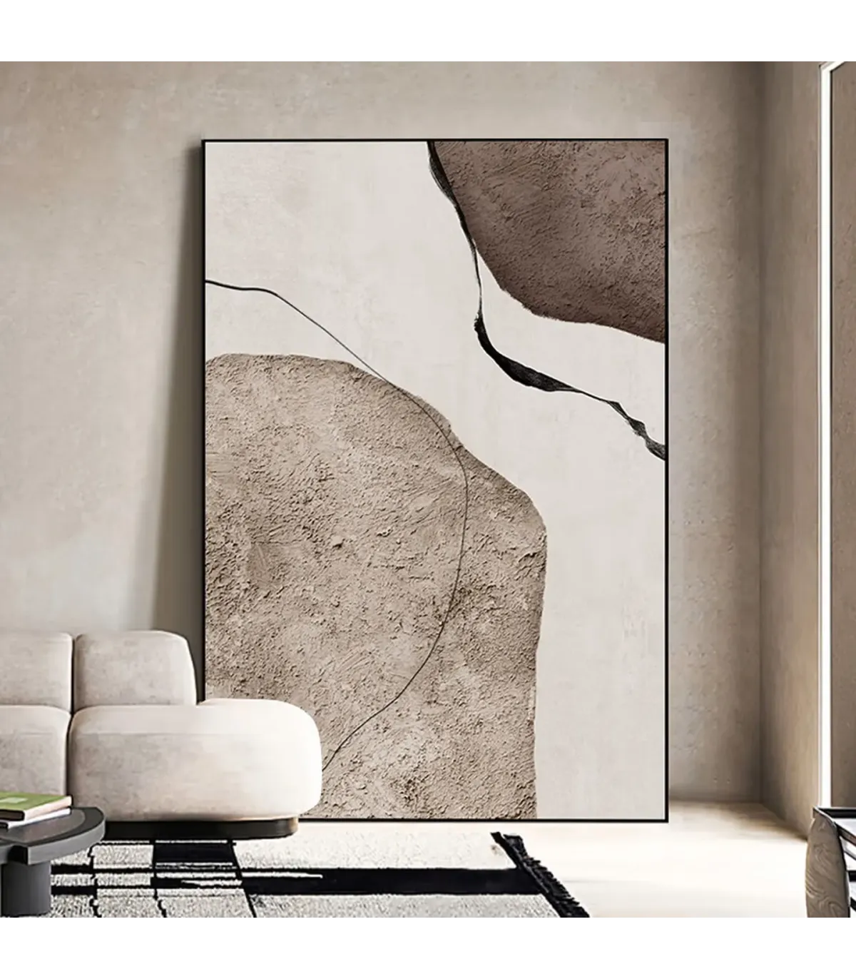 This hand-painted canvas evokes natural erosion through textured beige and brown forms divided by organic black lines. Its raw elegance suits both Minimalist Beige Canvas Dining Room and Abstract Neutral Tone Canvas Bedroom settings, adding warmth and quiet sophistication to modern interiors.