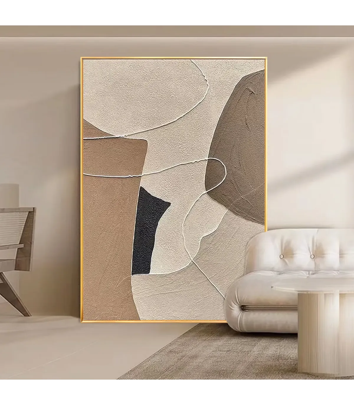 This hand-painted oil painting captures the essence of abstract minimalism with a textured surface that evokes natural stone formations. The composition blends neutral tones—beige, tan, black, and white—into a harmonious visual rhythm, making it a striking focal point for any modern living room or hallway. Inspired by wabi-sabi aesthetics, this wall art celebrates imperfection and serenity, offering a refined yet grounded atmosphere to your space. Ideal for those seeking abstract wall art with depth and character.