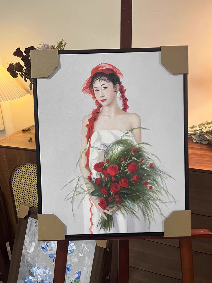 The classical style oil commission arrived safely and looks museum-quality. The lighting on the vintage dress is superb. This is a high-end decorative painting that truly stands out in my office.