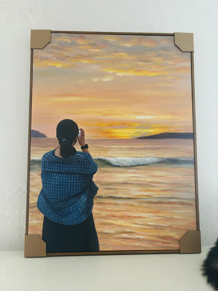 Seeing this commemorative landscape portrait in person is incredible. The sunset colors are blended beautifully. It captures a special moment from our vacation in a way a simple photo never could.