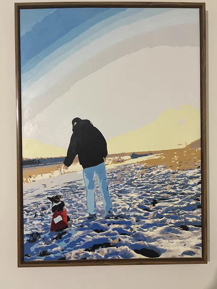 The palette knife style on this winter landscape is incredible. It captures such a peaceful moment with my dog. This custom pet portrait is a unique piece of art that I will cherish forever.