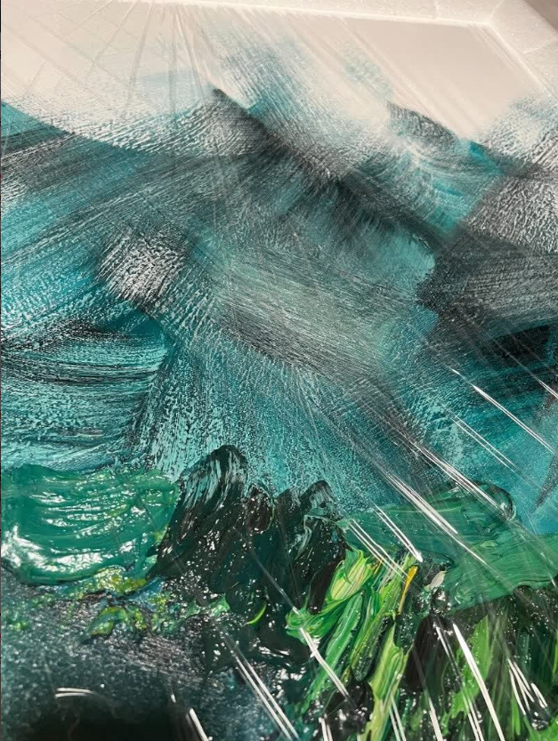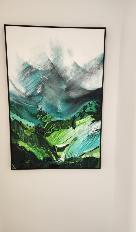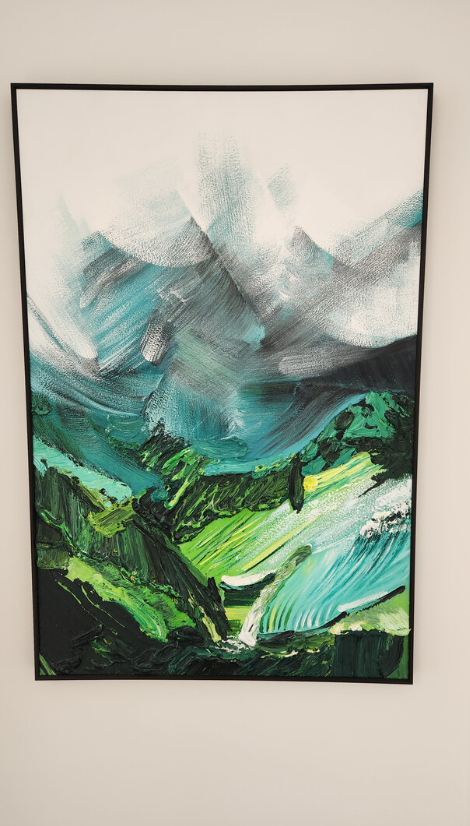 The painting is absolutely gorgeous. The abstract mountain scene and textured brushwork create a peaceful yet bold atmosphere. It’s a beautiful piece of modern wall art. Service was excellent.