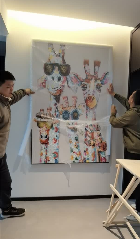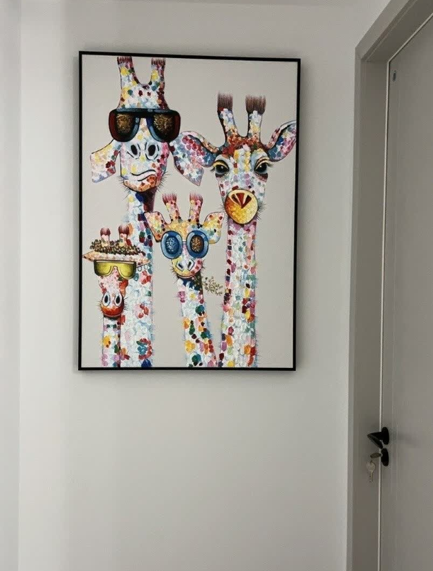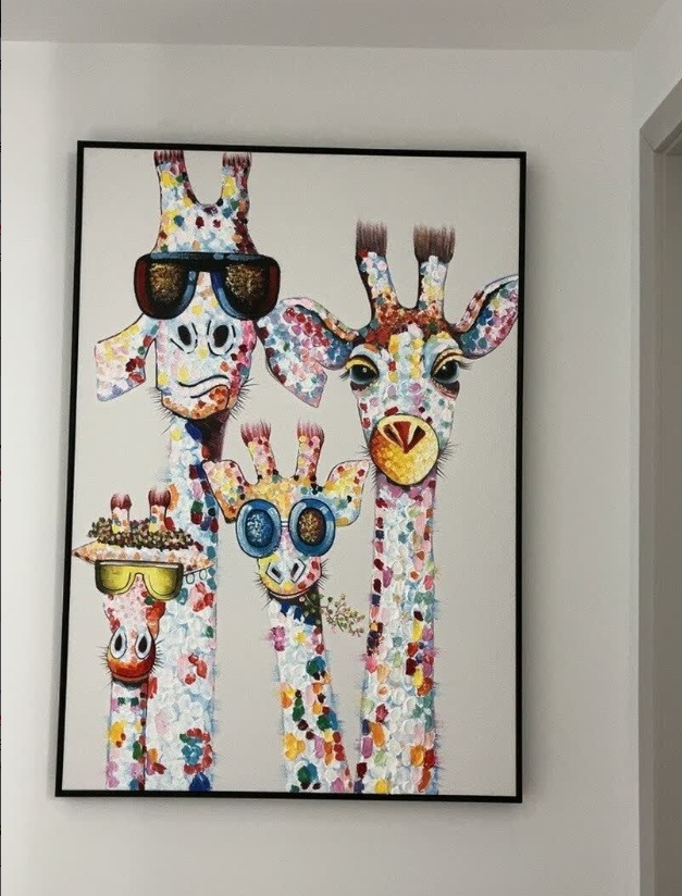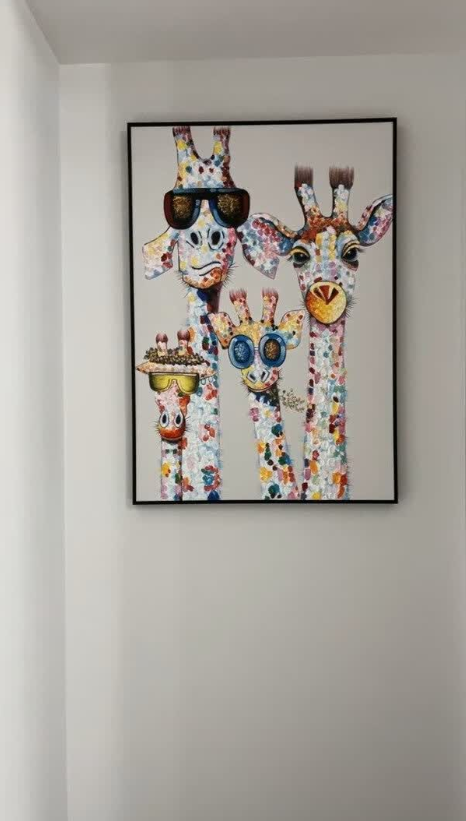 This hand-painted giraffe family painting adds a joyful and artistic touch to our home. The brushwork is expressive and the colors are vibrant. It’s a beautiful piece of modern wall art that fits perfectly with our decor. Delivery was smooth and packaging was secure.