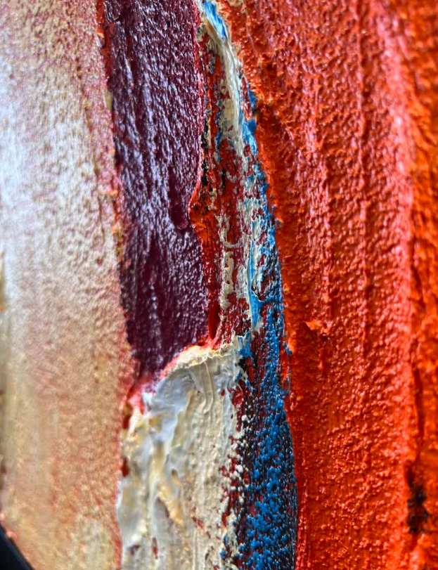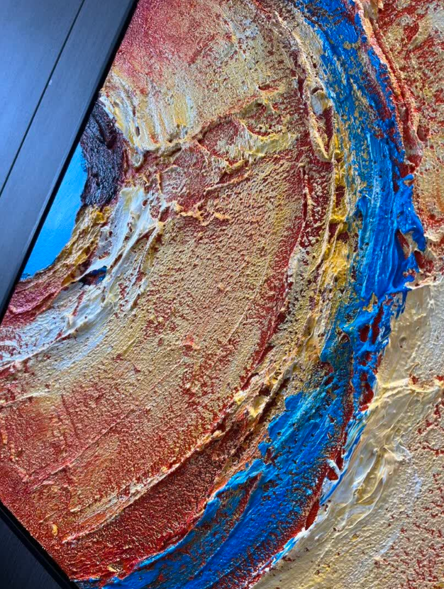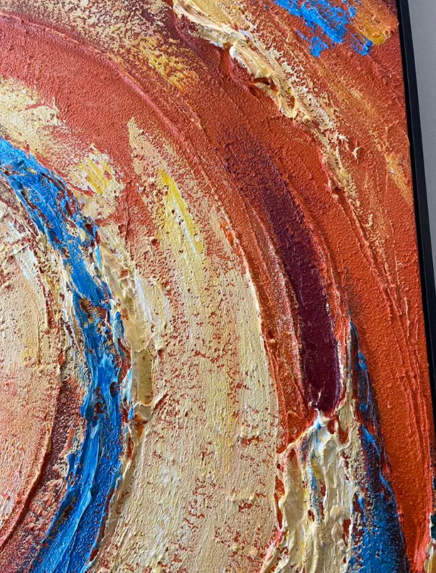 The orange hues in this abstract painting bring warmth and energy to our space. It’s hand-painted with beautiful texture that catches the light in a lovely way. I’m impressed by the quality and the overall aesthetic. Great service too.