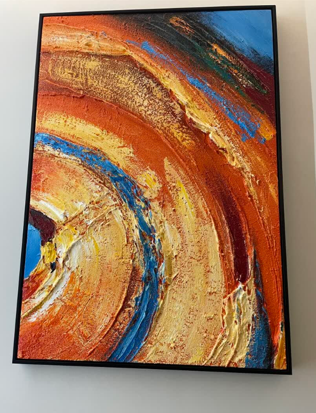 This abstract orange painting is a stunning piece of art. It fits perfectly with our minimalist decor and adds a pop of color without being overwhelming. The texture is impressive and gives it a gallery-like feel. Highly recommend for anyone seeking modern wall art.
