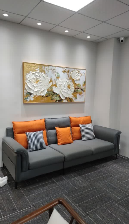 This abstract oil painting brings warmth and sophistication to our bedroom. The hand-painted details and layered texture give it a gallery-quality feel. I love how the peony motif blends with the gold and blue tones. It’s a beautiful piece of modern wall art that elevates the space.