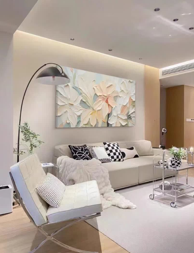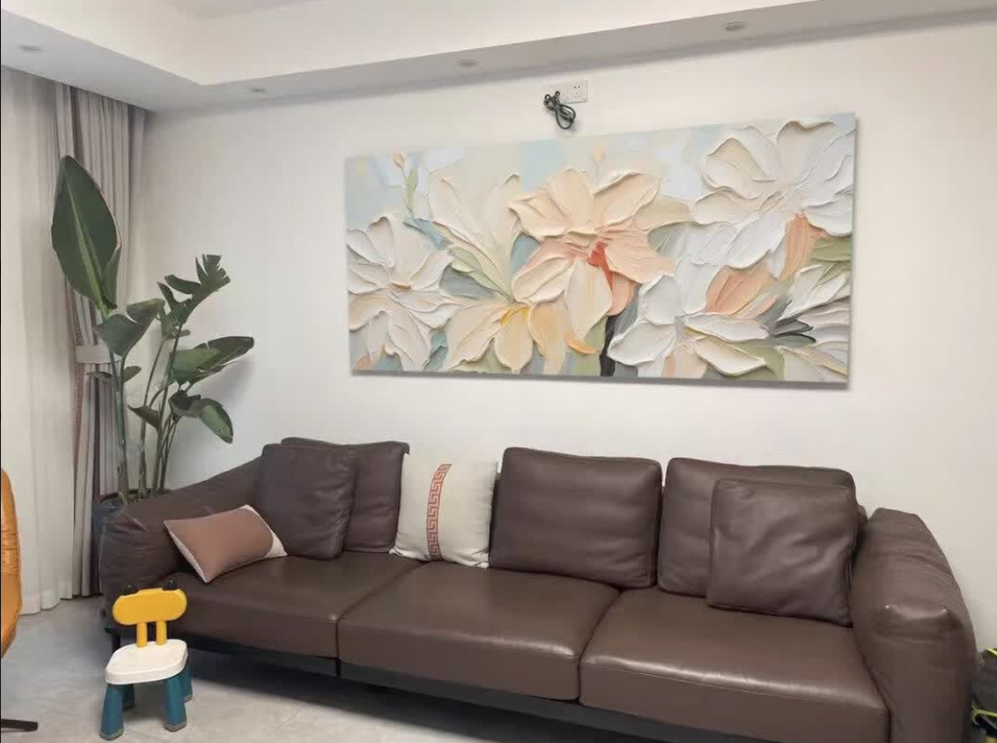 This hand-painted floral oil painting is a masterpiece. The creamy tones and raised textures give it a luxurious feel. It fits perfectly with our minimalist decor and adds a soft artistic touch. Shipping was smooth and the painting arrived in perfect condition.