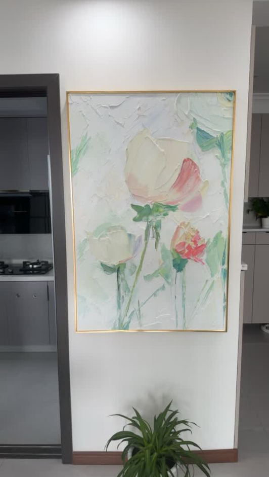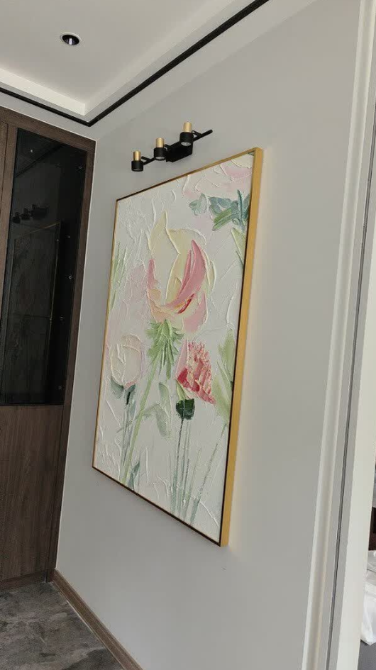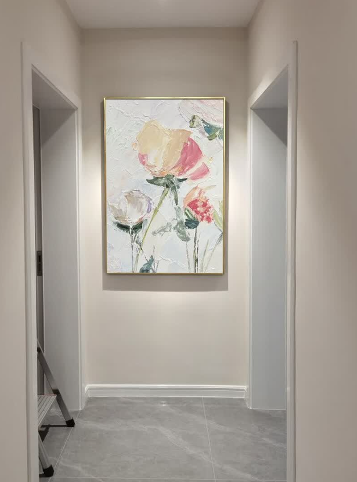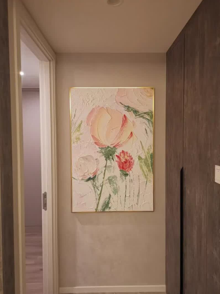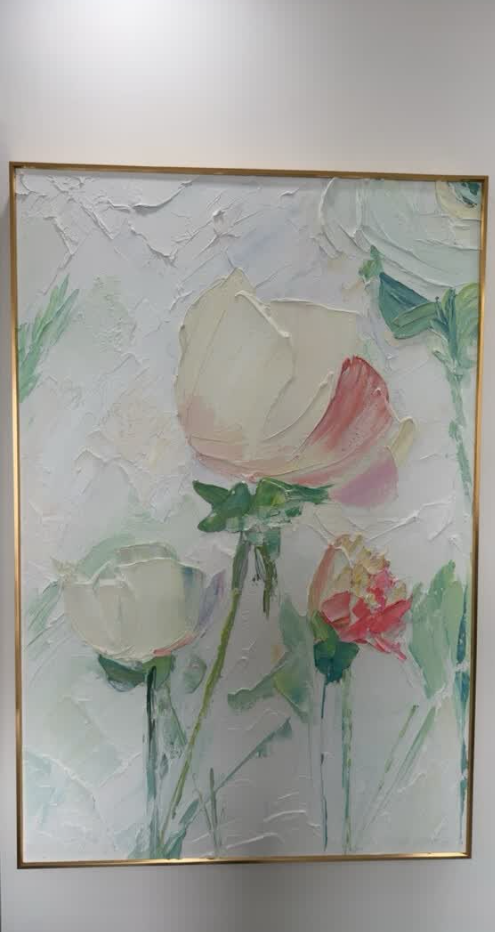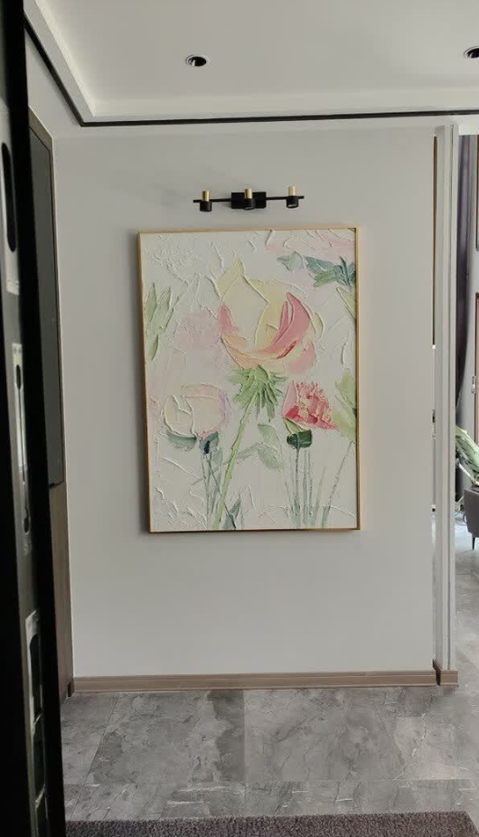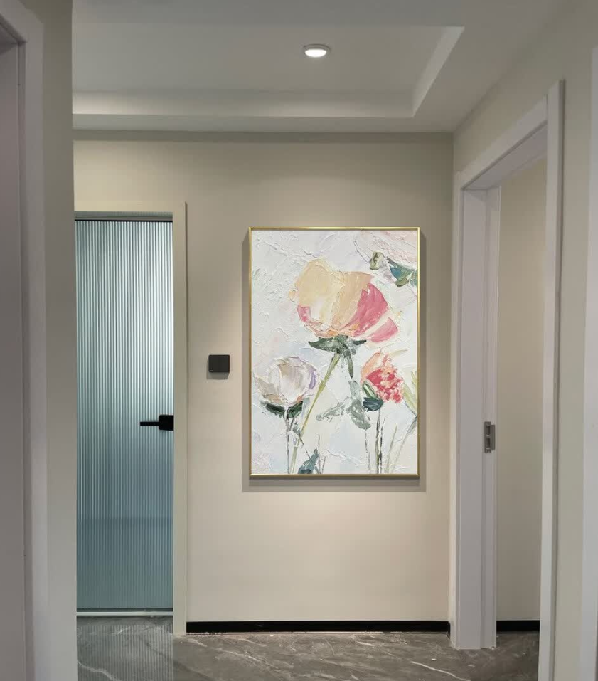 I love how this hand-painted oil painting adds a calming presence to my entryway. The floral texture is delicate yet bold, and the overall composition is perfect for a modern decorative canvas. Shipping was fast and the packaging was excellent.