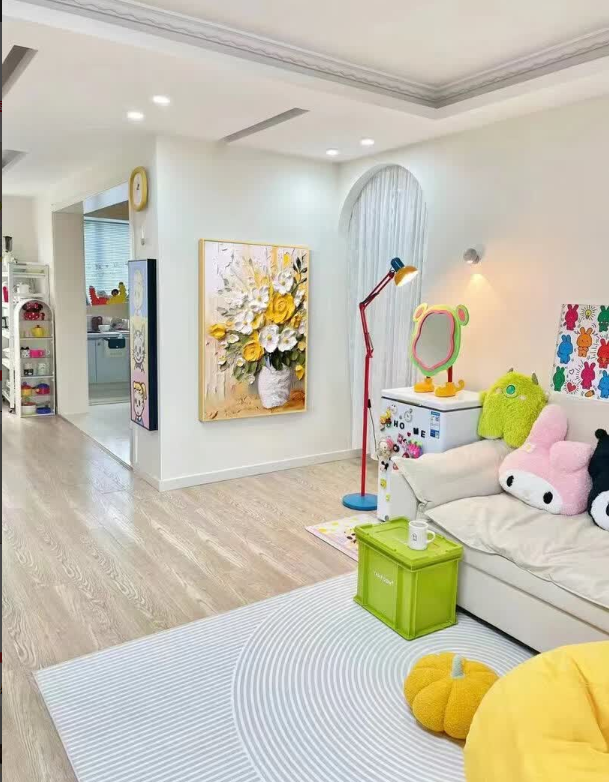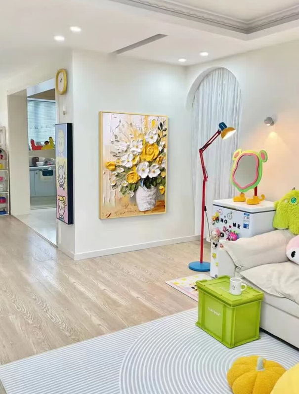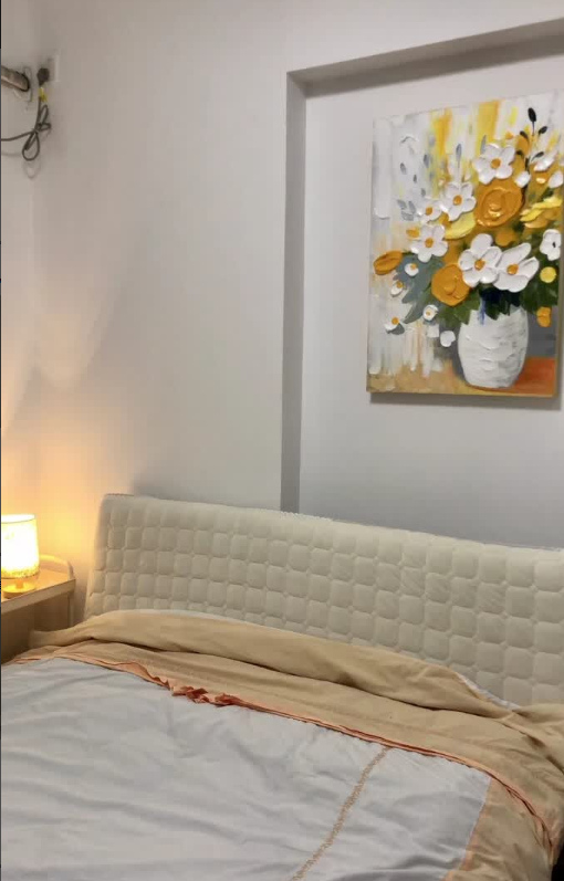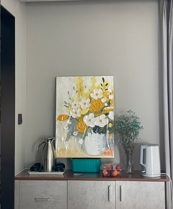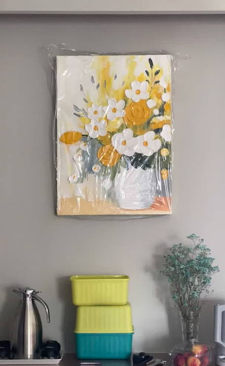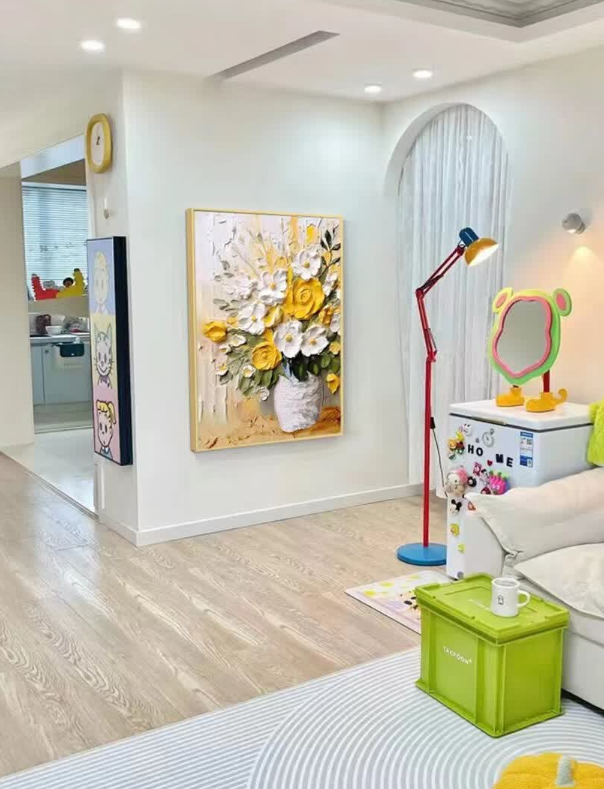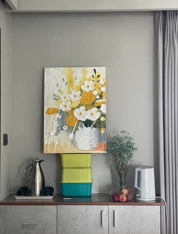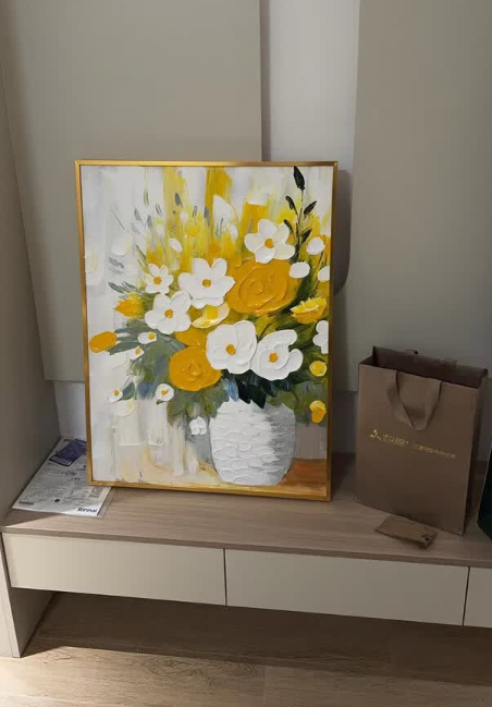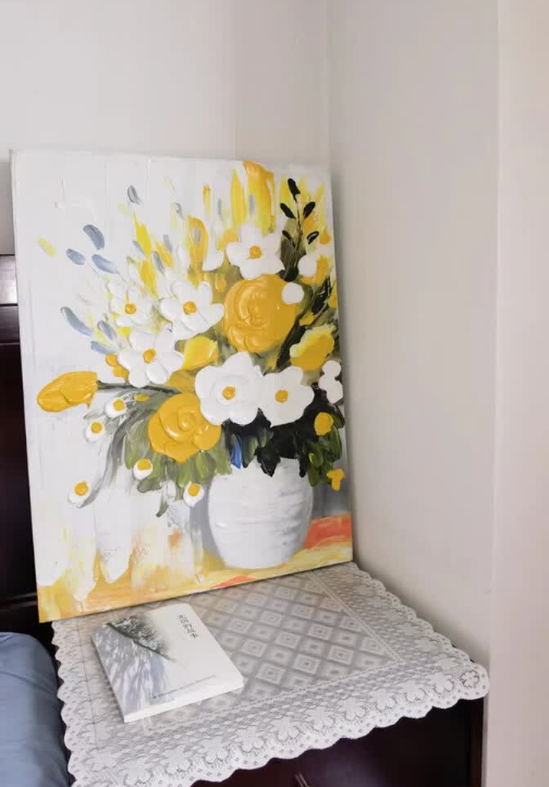 I love how the light hits the 3D palette knife textures on this canvas. This bespoke floral artwork feels very exclusive and high-end. It is definitely the best decorative painting I have purchased for my master bedroom renovation project.