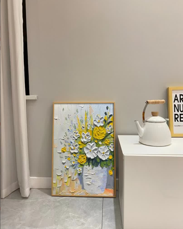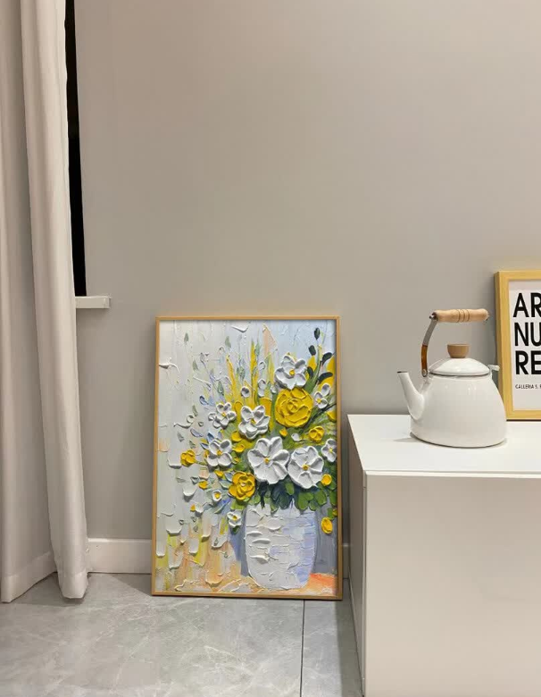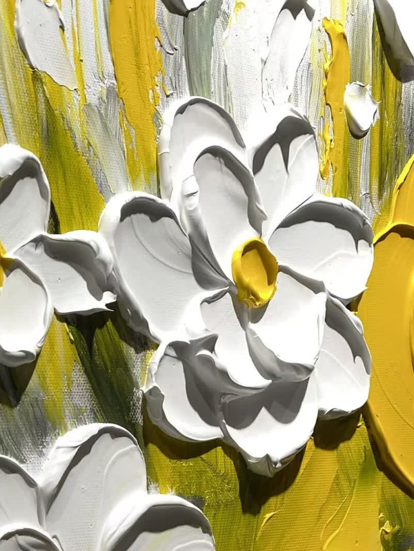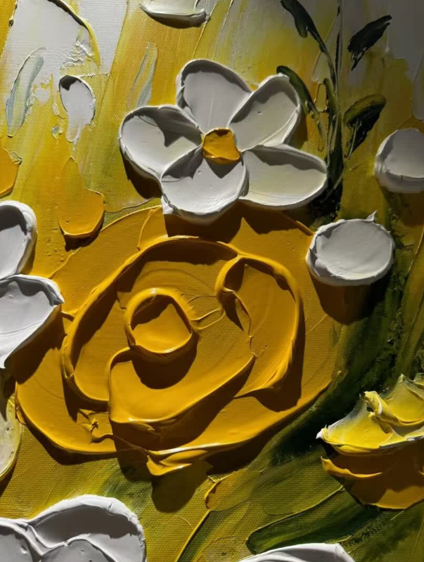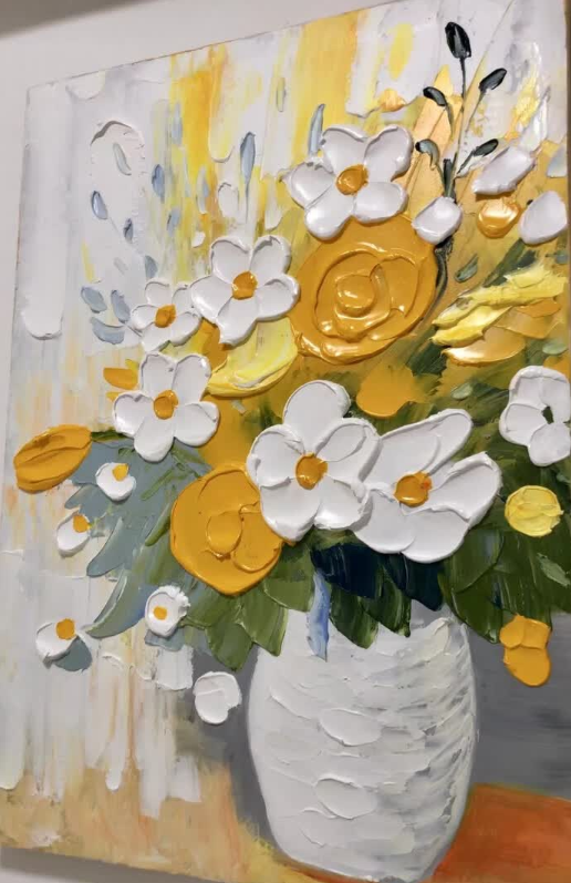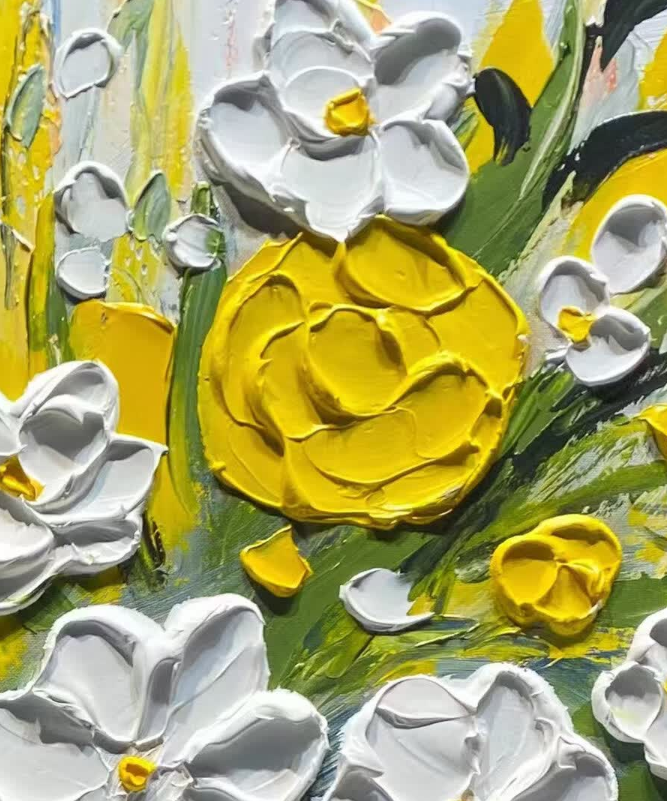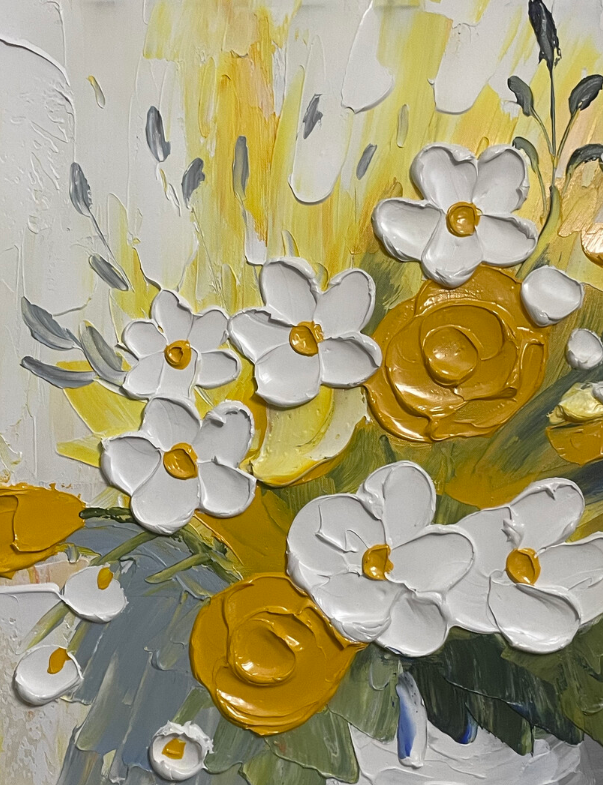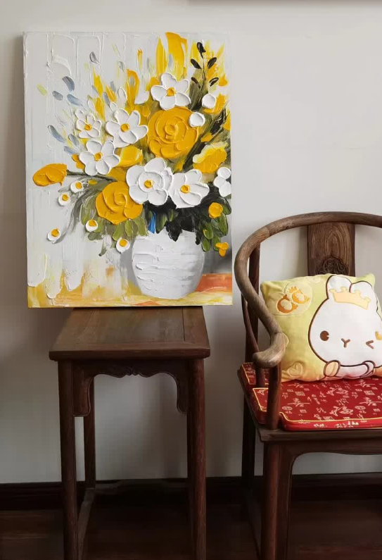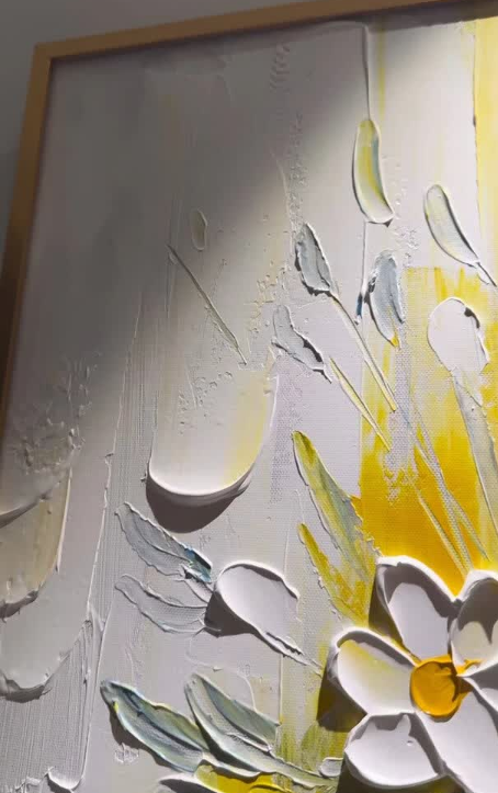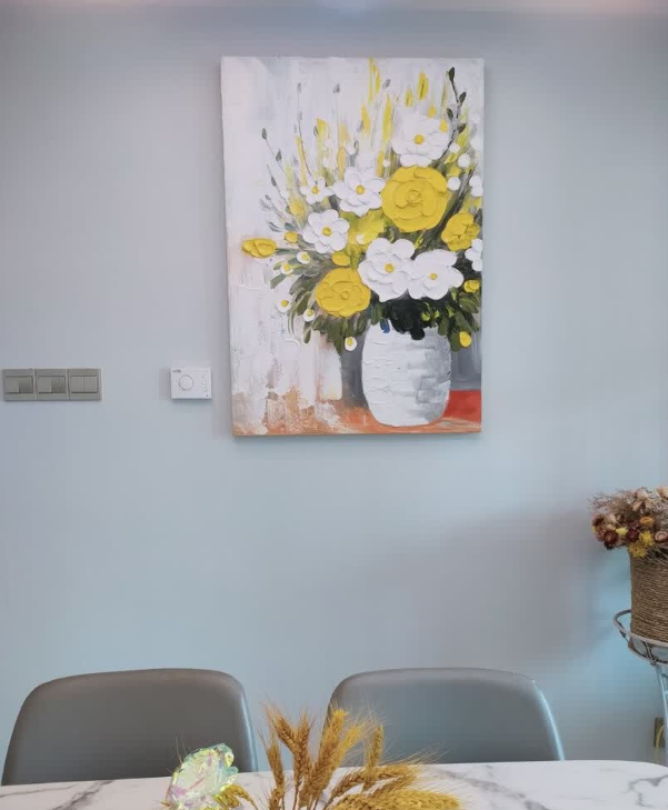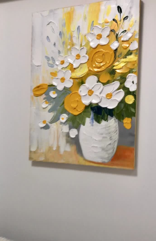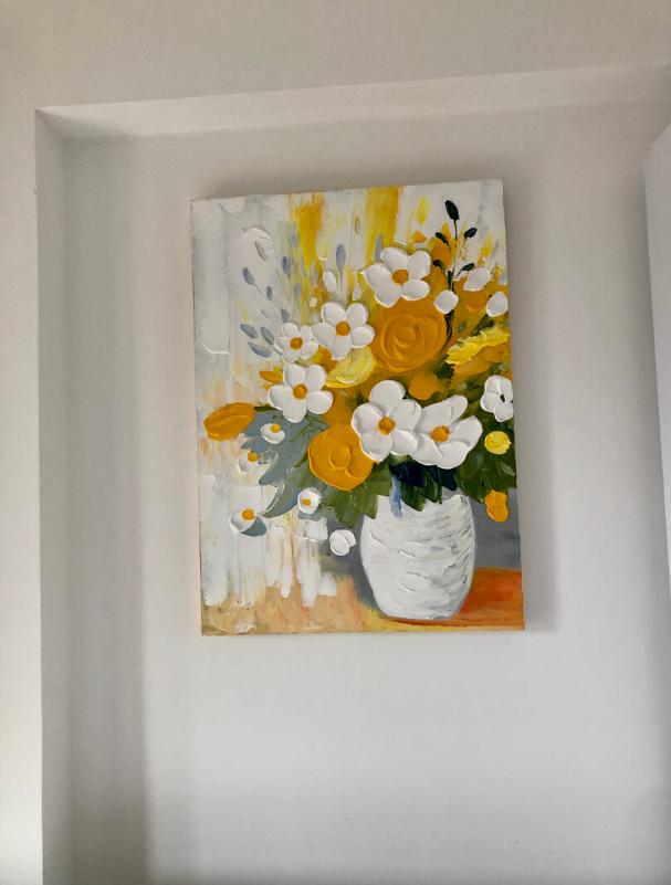 This yellow and white floral oil painting brings so much warmth to my dining area. The thick impasto technique gives it a wonderful three-dimensional look. It is a high-quality hand-painted masterpiece that guests always compliment.