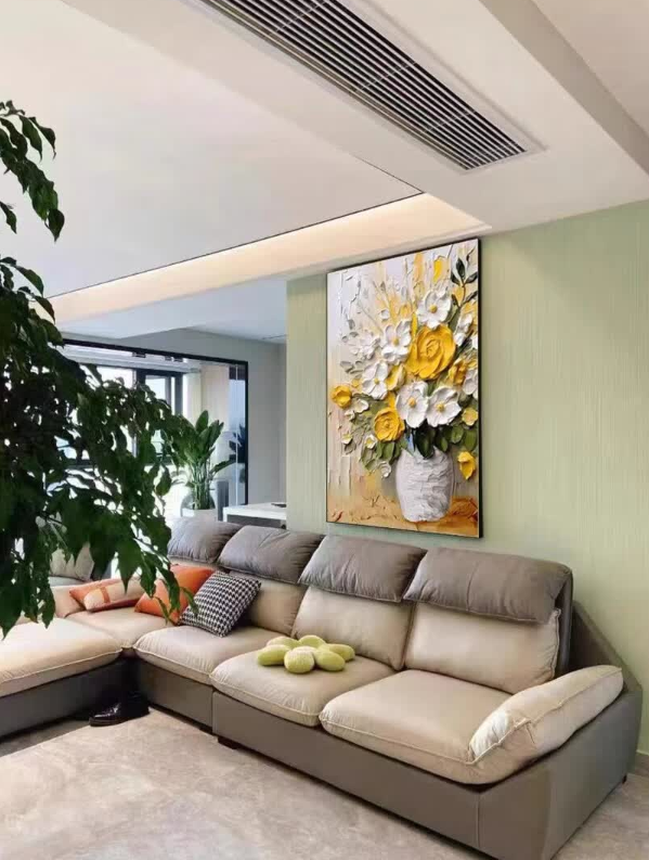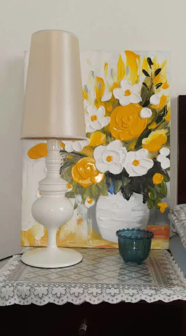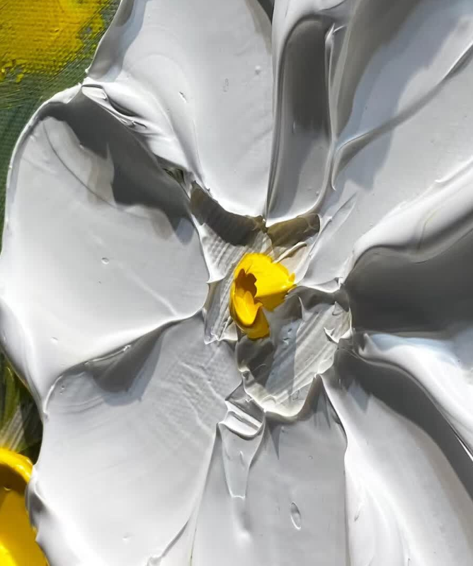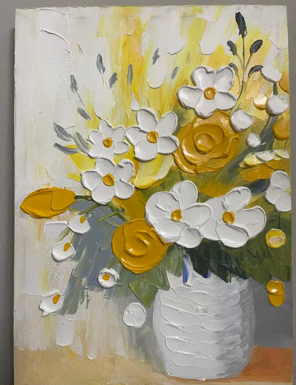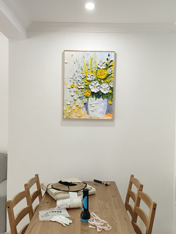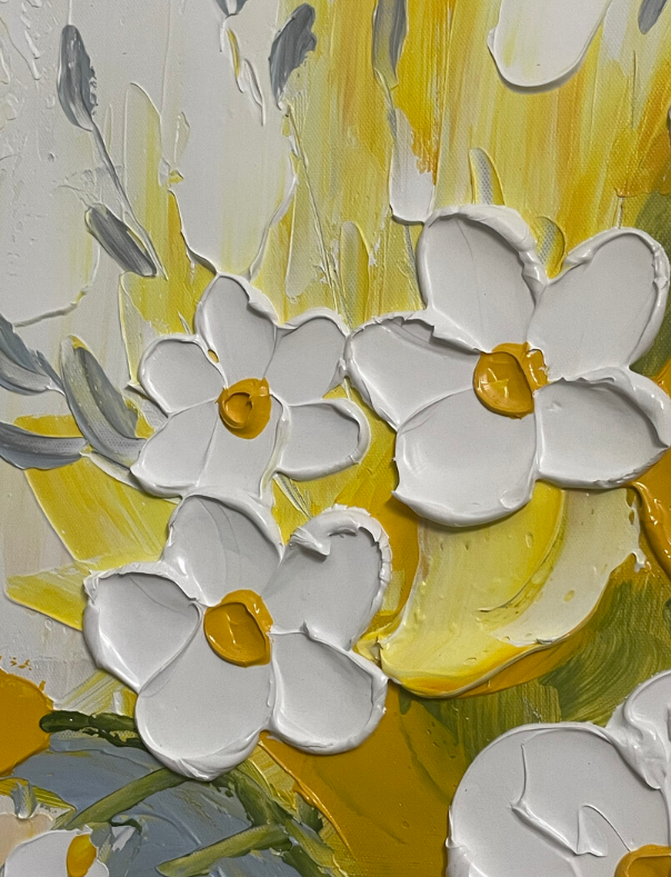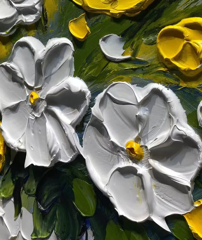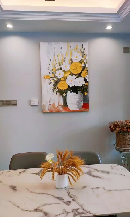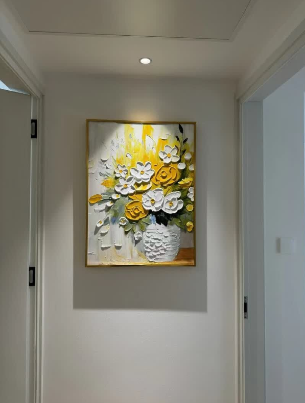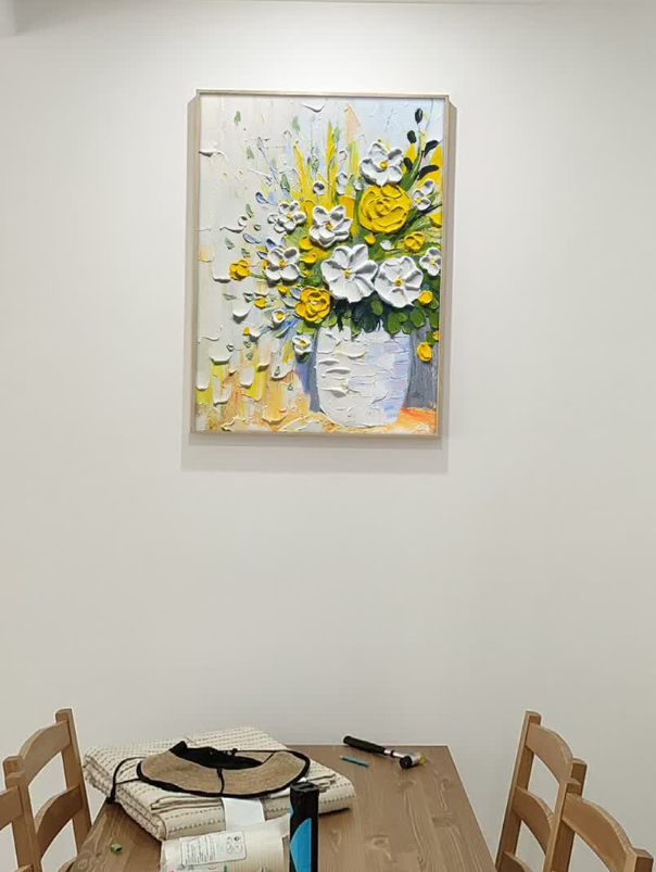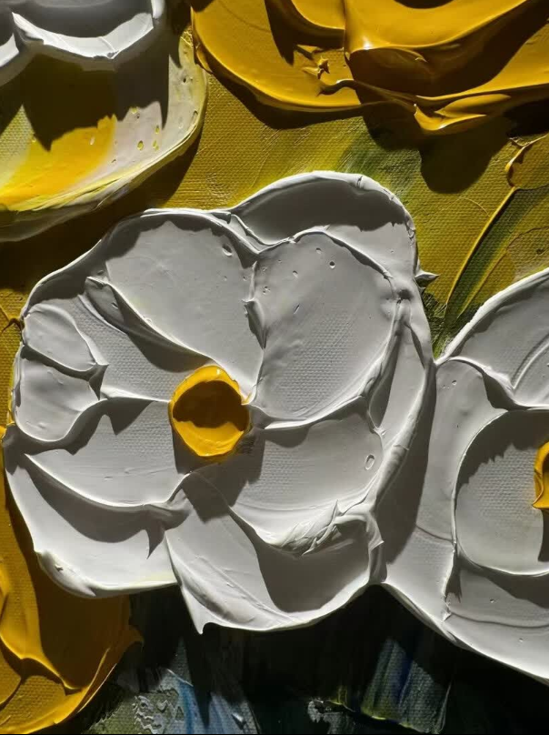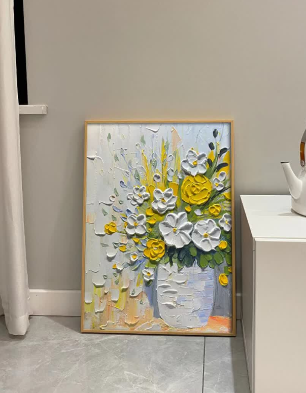 This yellow and white floral oil painting brings so much warmth to my dining area. The thick impasto technique gives it a wonderful three-dimensional look. It is a high-quality hand-painted masterpiece that guests always compliment.