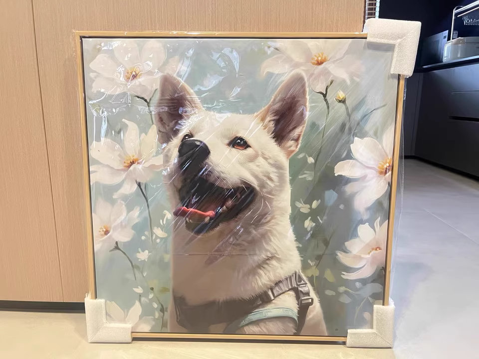 The vibrant colors in this impressionist pet art are breathtaking. You can feel the thick oil paint texture in the flowers and sky. It perfectly captures my dog??s happy spirit in the sun.