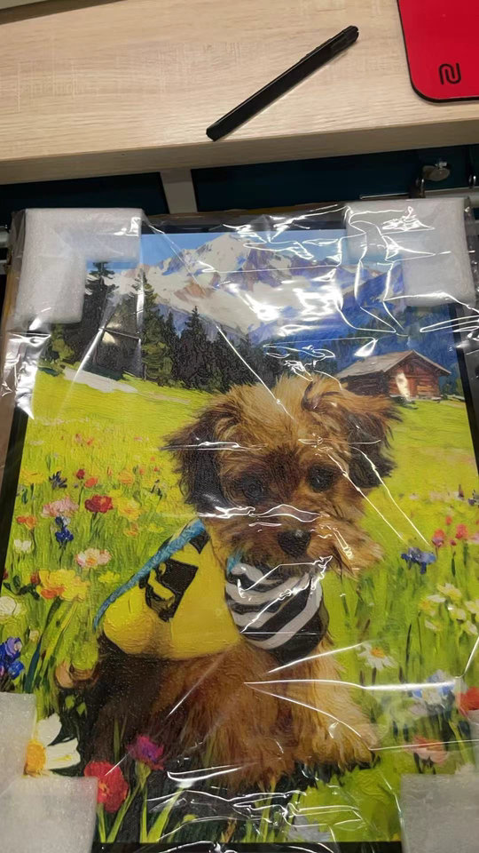 We ordered a personalized dog painting as a gift. The mountain landscape background is breathtaking. It is much better than a digital print because it is a real oil painting with depth and soul.
