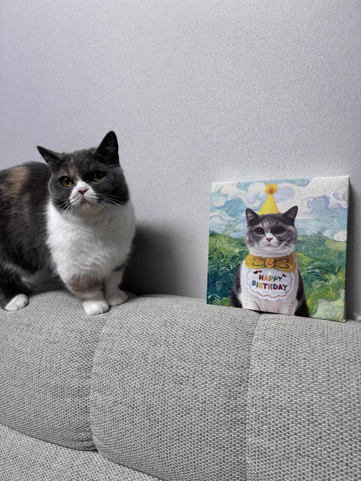 The quality of these gallery-wrapped cat canvases is superb. Each brushstroke brings out the soft fur and bright eyes of my pets. A truly premium custom pet portrait that brightens our living room.