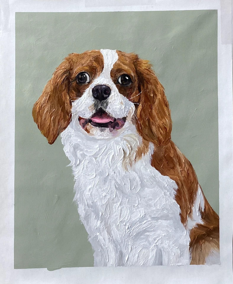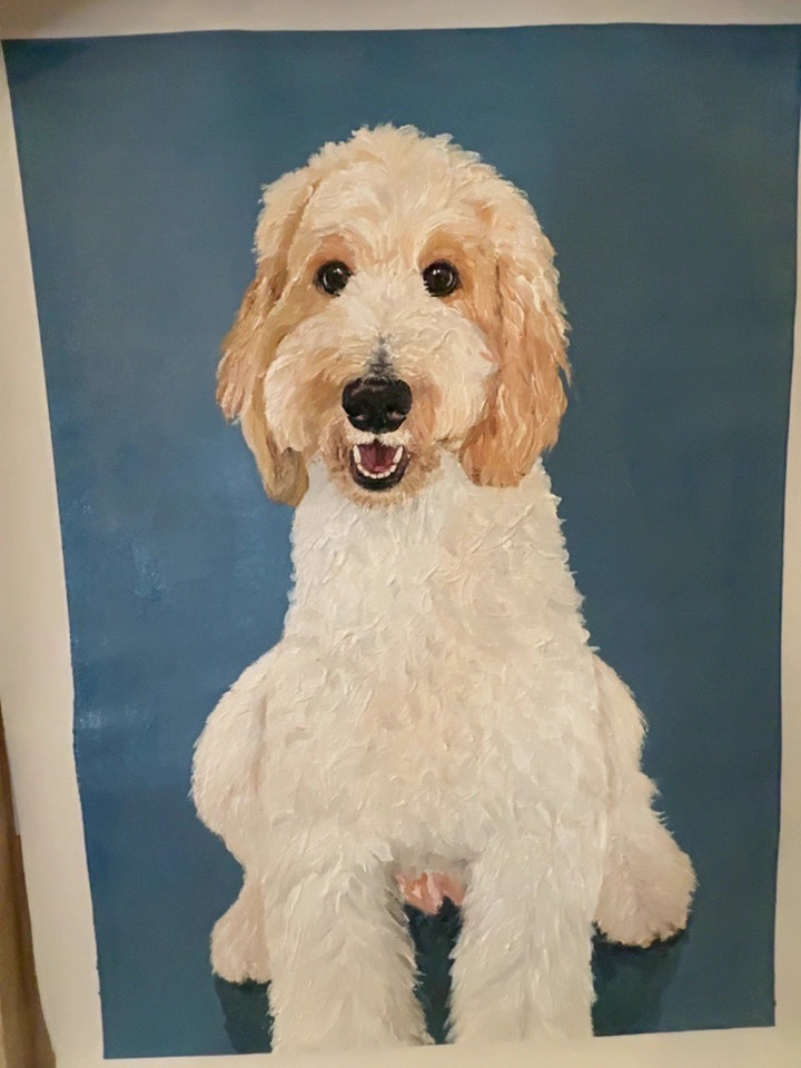 The custom pet oil painting of my Bichon is stunning! The artist perfectly captured his fluffy texture against the vibrant blue floral background. It looks exactly like him and feels so high-end.