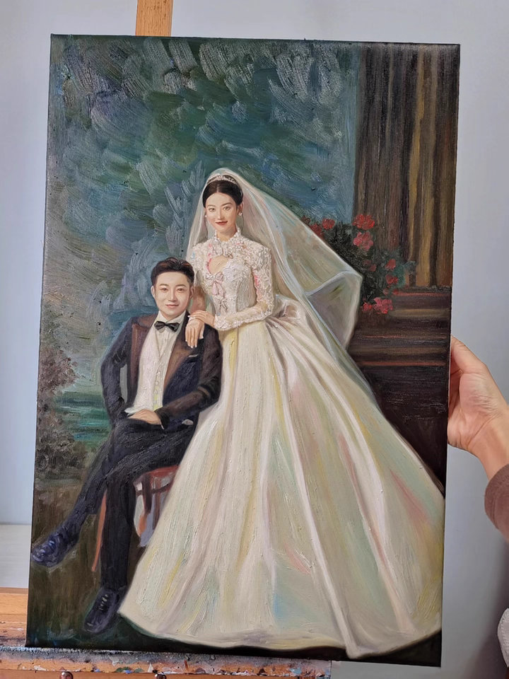 Our hand-painted wedding portrait is the centerpiece of our bedroom. It captured the elegance of my dress perfectly. A timeless anniversary oil painting that we will cherish forever.