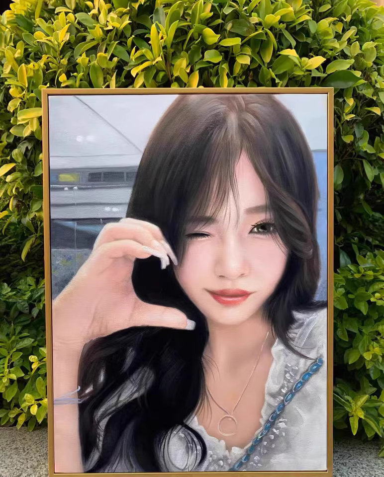 The quality of this custom oil painting from photo is breathtaking. The artist captured the joyful expression and the vibrant colors of the bouquet perfectly. It is a stunning personalized portrait.