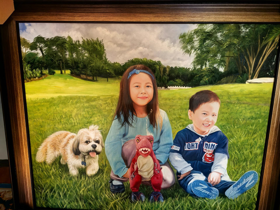 This custom family oil painting of my children and our dog is priceless. The artist captured their smiles and the dinosaur toy so well. It is now the focal point of our living room wall decor.